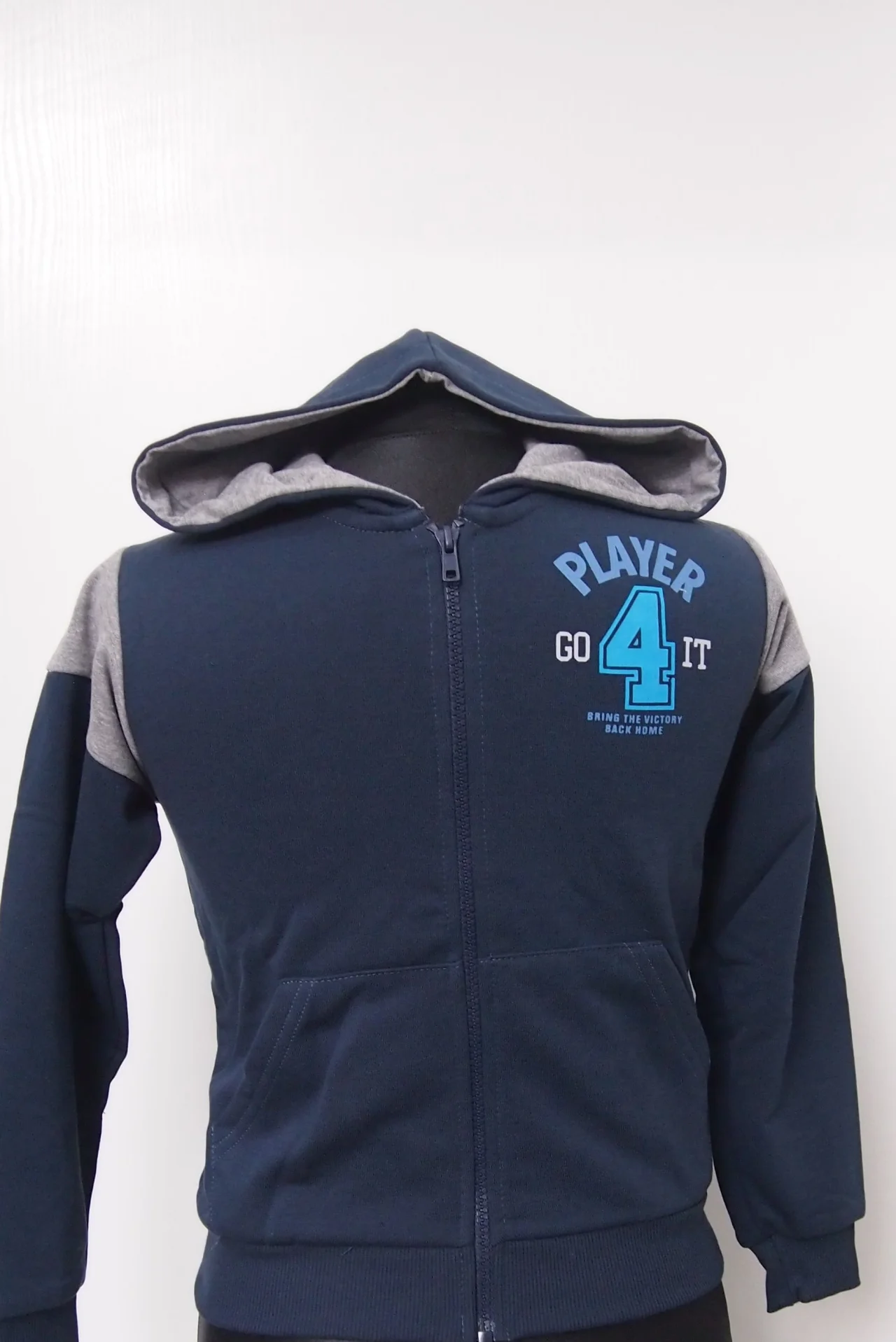 Chłopięca bluza dresowa na długi rękaw została wykonana z wysokiej jakości bawełny. Bluza zapinana na zamek, posiada dwie boczne kieszenie oraz kaptur. Przód zdobi kolorowa aplikacja. Rękawy zakończone ściągaczem.