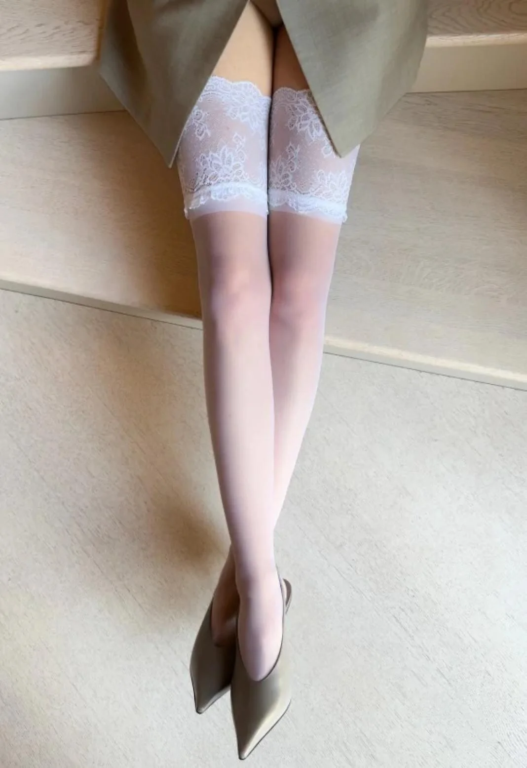Pończochy samonośne damskie - matowe, przezroczyste o grubości 20 den - góra zakończona szeroką koronką (10 cm) o kwiatowym motywie - wewnętrzna strona z podwójnym paskiem silikonu - brak wzmocnień na palcach   Skład: 88% poliamid, 12% elastan