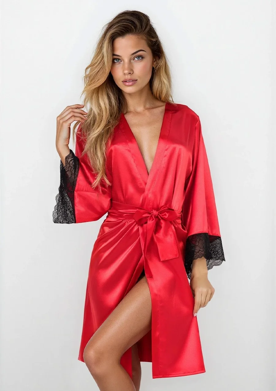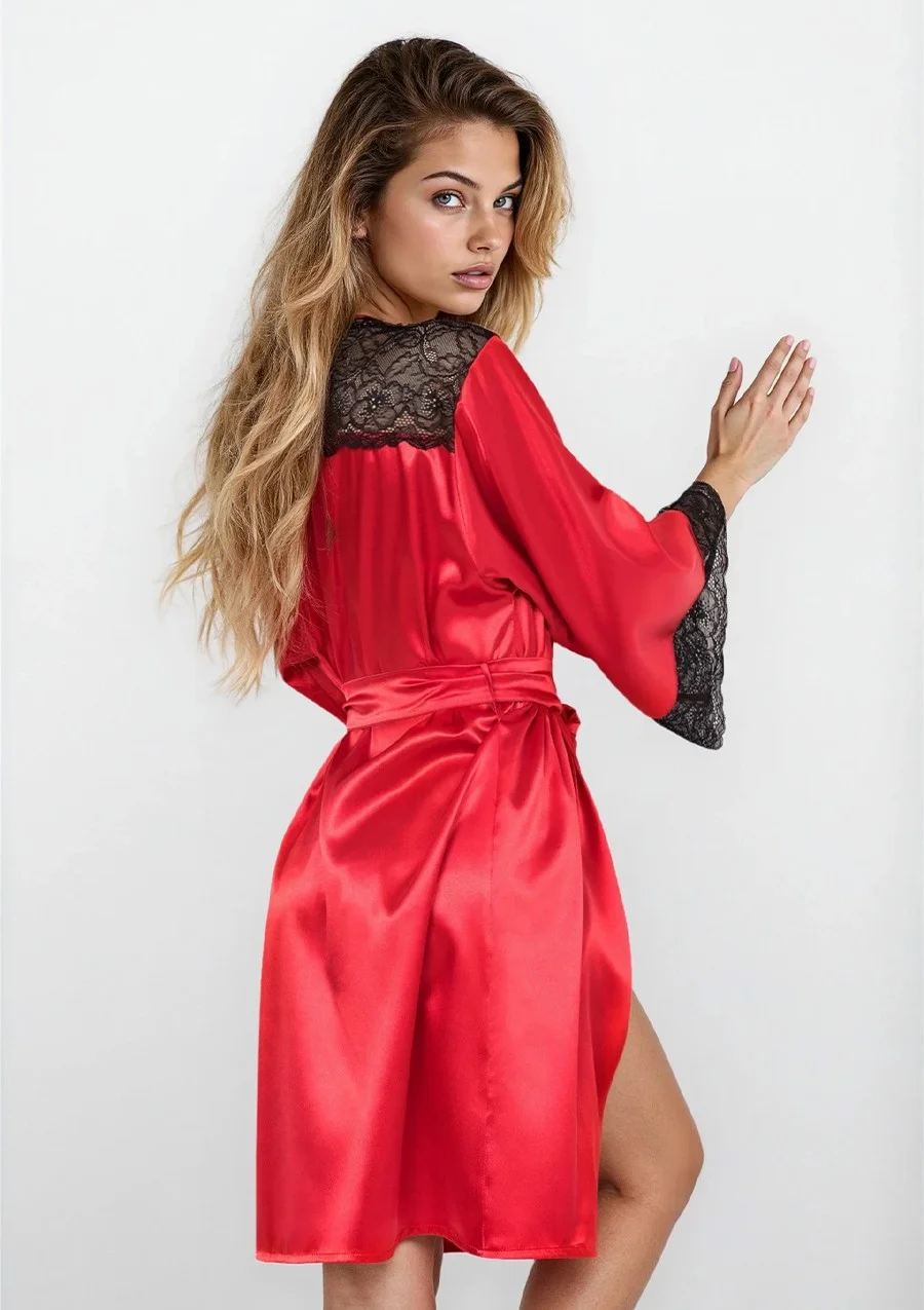 SATYNOWA ZWIENWNA PODOMKA Z SZERSZYMI RĘKAWAMI ORAZ SATYNOWYM PASKIEM. GÓRĘ PLECÓW ORAZ RĘKAWKI ZDOBI DELIKATNAW DOTYKU KORONKA. DOSTĘPNE WSZYSTKIE WESRJE SATYNY Z CZARNĄ KORONKĄ.
