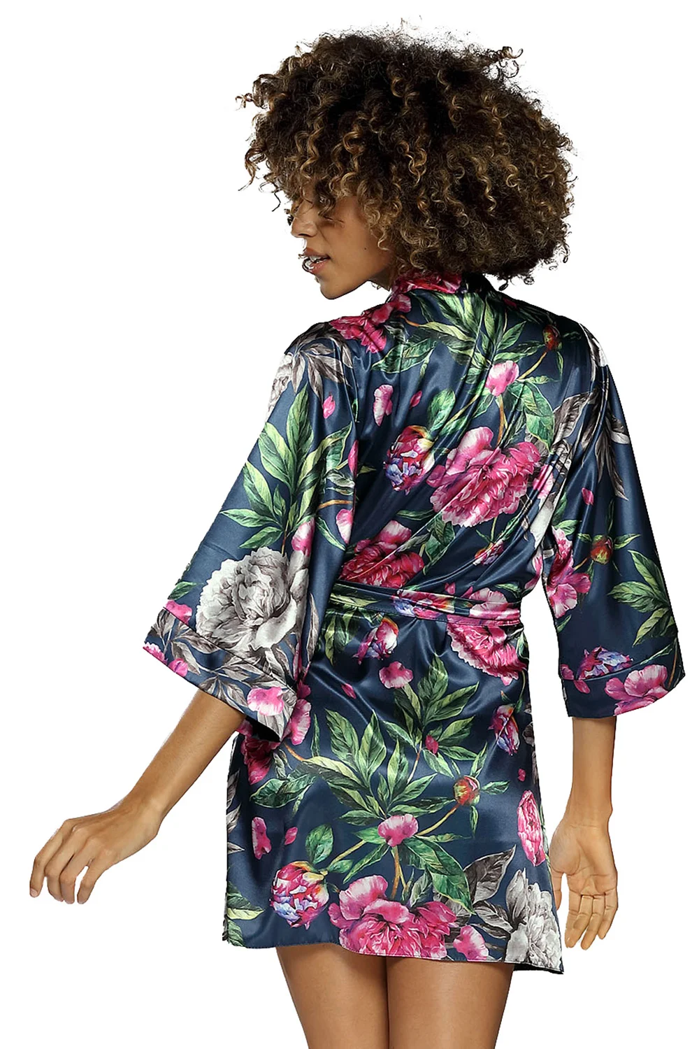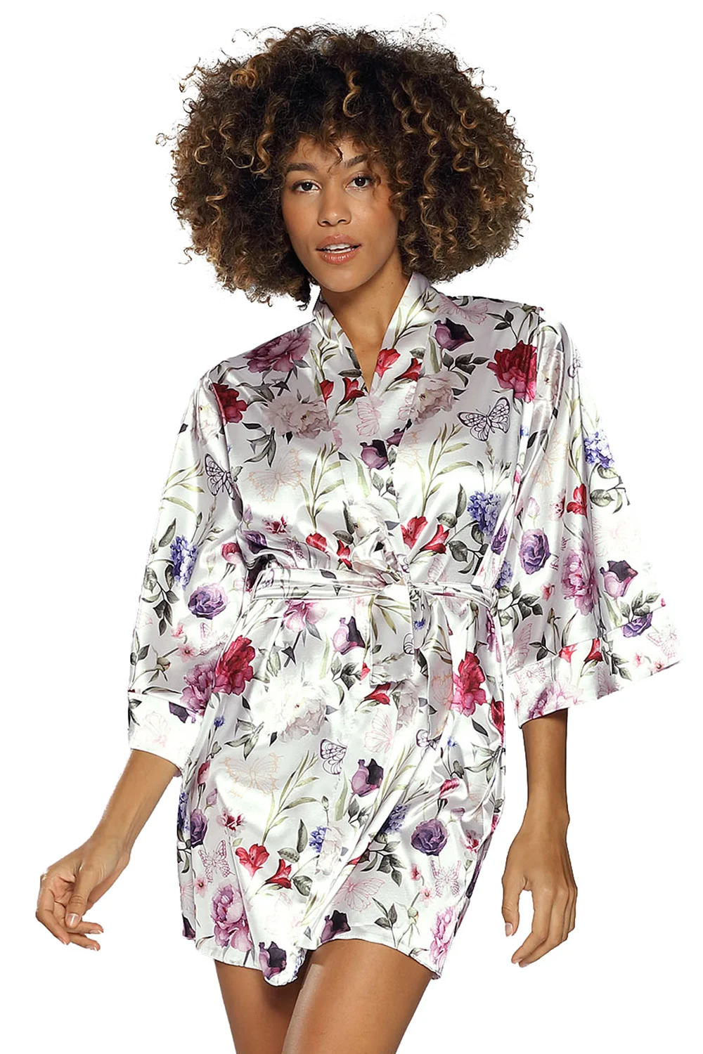 Klasyczny krótki szlafrok uszyty z zwiewnej, drukowanej satyny. Rękawy kimonowe. Po bokach dwie szlufki oraz dołączony do podomki pasek, z którego możesz stworzyć przepiękną kokardę, podkreślając Twój wdzięki oraz urok osobisty. Dostępna w 11 wzorach. Pozwól sobie na otulenie się jedwabistym dotykiem satyny.