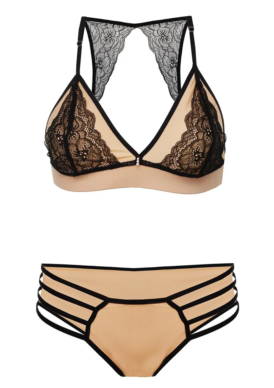 Co powiesz na seksowny komplet składający się z biustonosza oraz zabudowanych fig? Biustonosz wykonany jest z miękkiego materiału. Na środku miseczek doszyta jest subtelna czarna koronka. Na plecach, przy ramiączkach również doszyta jest ta sama elegancka koronka. Figi zdobią po bokach trzy czarne gumeczki. Ten zestaw idealnie nadaje się na gorącą, upojną noc z ukochanym. Poczujesz się w nim kobieco i kokieteryjnie, a Twój partner z pewnością to zauważy. Komplet dostępny jest w dwóch wersjach kolorystycznych - czarnej oraz beżowej. Przed zakupem, zachęcamy do skorzystania z powyższej tabelki z rozmiarówką. Dzięki niej będziesz mieć pewność, że wybrany model będzie pasował idealnie. Z przyjemnością Ci pomożemy! Jak prać i prasować poliamid? Materiał poliamid warto prać ręcznie w temperaturze 30°C. Prosimy nie chlorować i nie czyścić chemicznie. Delikatnie suszyć,a prasować w temperaturze 110°C. Skład surowcowy: 89% poliamid, 11% elastan.