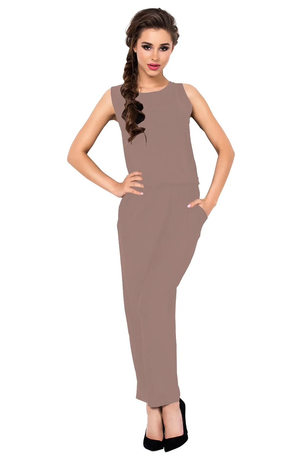 STYLOWY DAMSKI KOMBINEZON Z DŁUGIMI SPODNIAMI, WYKONANY Z DELIKATNEJ W DOTYKU WISKOZOWEJ DZIANINY. W PASIE ODCIĘTY GUMKĄ,KTÓRA POZWALA NA ODPOWEDNIE DOPASOWANIE PO BOKACH DWIE KIESZONKI. GÓRA KOMBINEZONU NA SZERSZYCH RAMIĄCZKACH, ZAPINANY Z TYŁU GUZIKIEM.