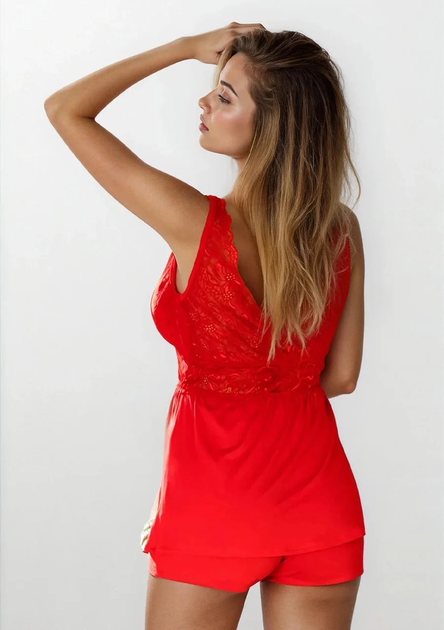 DWUCZĘŚCIOWY WISKOZOWY KOMPLET SKŁADAJĄCY SIĘ Z KRÓTKICH SPODENEK ORAZ KOSZULKI. KOSZULKA NA SZERSZYCH RAMIĄCZKACH Z KORONKI ODCIĘTY KORONKĄ POD BIUSTEM. MIECZKI PODSZYTE WISKOZĄ. Z TYŁU DEKOLT WYCIĘTY W LITERĘ V. CAŁOŚĆ DOPEŁNIA BRYLANCIK. DOSTĘPNA WERSJA KOLORYSTYCZNA: CZERWONA, GRANAT, CZARNY, ECRU (KORONKA W KOLORZE WISKOZY).