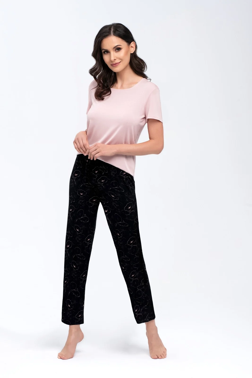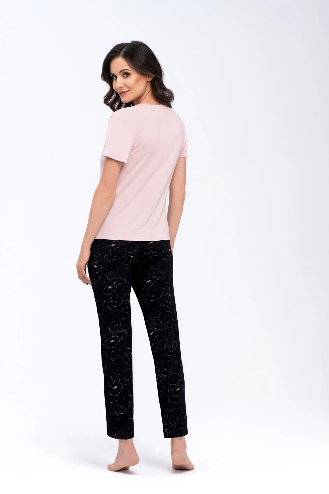 Piżama damska - wysokiej jakości wiskoza - koszulka z krótkim rękawem - półokrągły dekolt - długie, wzorzyste spodnie   Skład: 94% wiskoza, 6% elastan