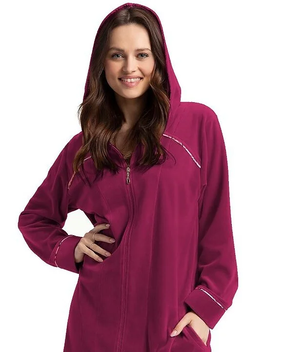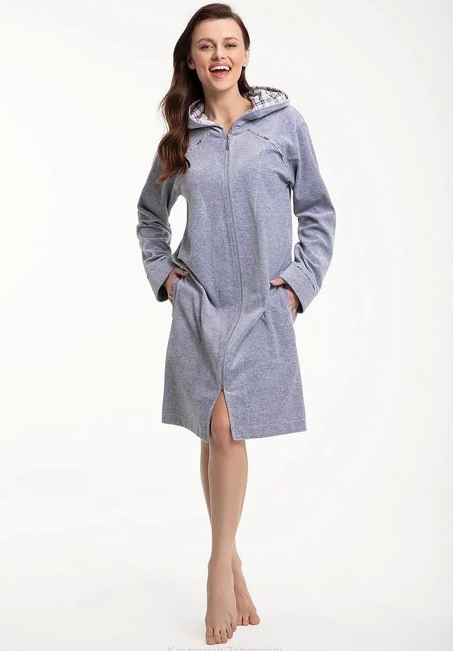 Szlafrok damski z kapturem - miły, miękki w dotyku - zapinany na zamek - na wysokości bioder wygodne kieszenie - mankiety, kieszenie i kaptur obszyte materiałem w kratkę   Skład: 82% bawełna, 18% poliester