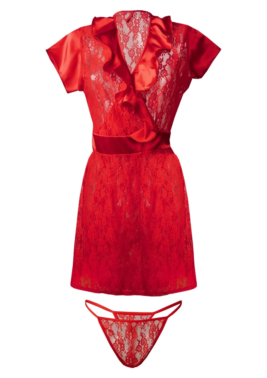 Planujesz romantyczny wieczór z ukochanym? W takich momentach idealnie sprawdzi się Podomka Mia. Zmysłowa, komfortowa, a jednocześnie pełna seksapilu. Ta podomka mieści w sobie wszystkie upragnione przez kobiety cechy. Podomka Mia składa się z obcisłej, dłuższej koszulki oraz stringów. Obydwa elementy bielizny wykonane są z czerwonej, kwiecistej koronki. Tylko rękawki, falbanka przy dekolcie oraz pasek podkreślający talię są z satynowego materiału - również w czerwonym kolorze. Marzysz o zaskoczeniu swojego partnera zmysłową bielizną? Chyba już znalazłaś odpowiedni model. Podomka Mia będzie do tego idealna. Zresztą, przekonaj się o tym osobiście! Zachęcamy jeszcze, aby przed złożeniem zamówienia zapoznać się z tabelką z rozmiarówką. Dzięki temu unikniesz wybrania niewłaściwego rozmiaru bielizny. W razie jakichkolwiek pytań, jesteśmy do Twojej dyspozycji. Bądź sexy z Dkaren! Wybieraj seksowne piżamy damskie !