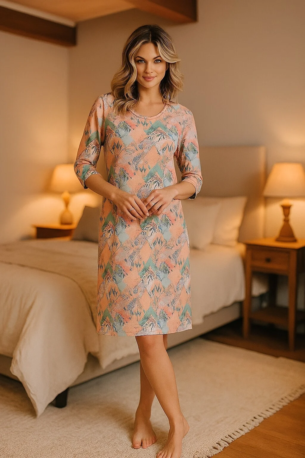 Koszula damska - wysokiej jakości delikatna bawełna - roślinny print - okrągły dekolt z satynową kokardką - rękawy o długości 7/8 - długość do kolan   Skład: 100% bawełna