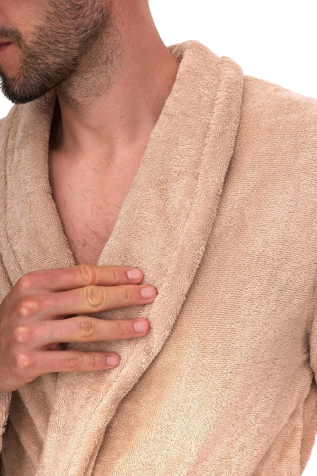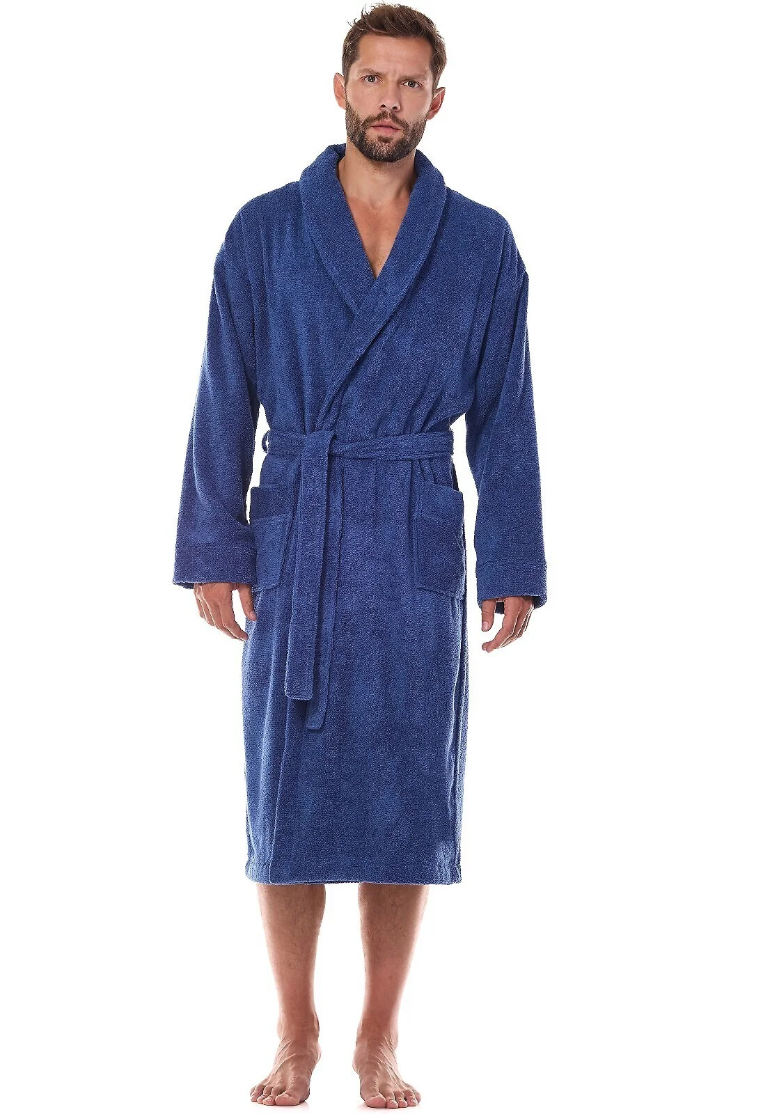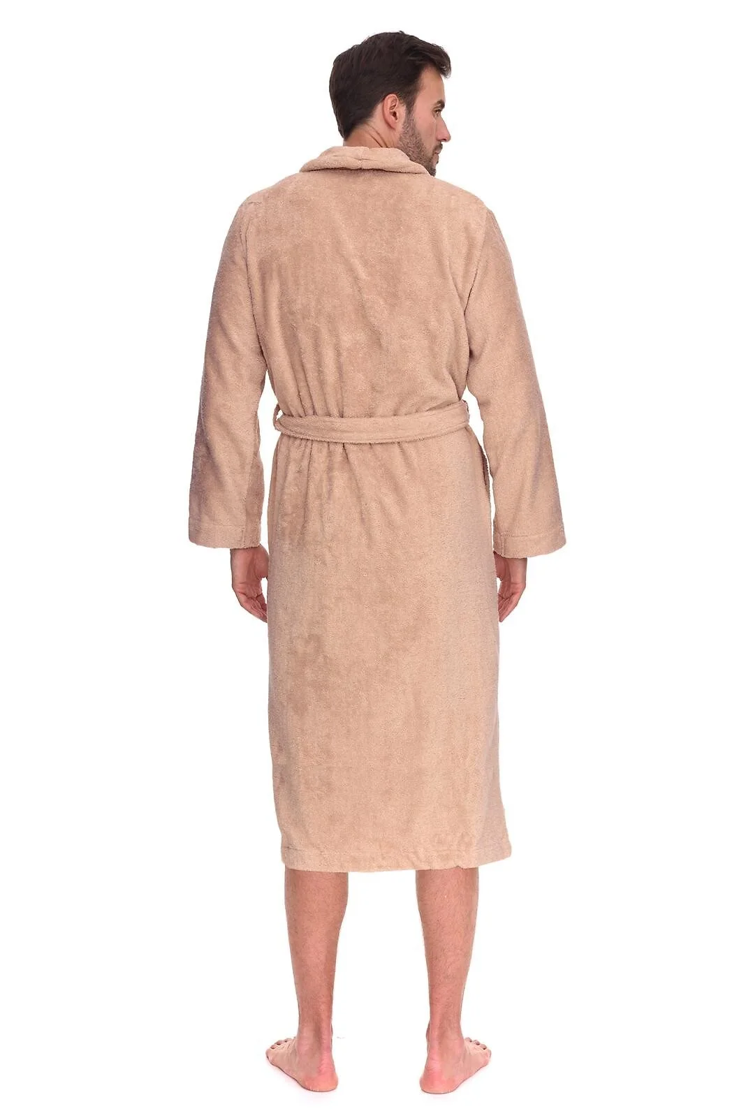 Długi szlafrok męski - miękka, bawełniana dzianina frotte - szalowy kołnierz - wiązany w pasie - po bokach wygodne kieszenie   Skład: 100% bawełna