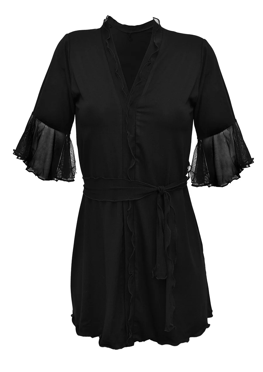 WISKOZOWA PODOMKA Z OZDOBNĄ TIULOWĄ FLISĄ. RĘKAWKI WYKOŃCZONE FALBANKĄ Z TIULU. DOŁĄCZONY TIULOWY PASEK WYKOŃCZONY MEREŻKĄ. PODOMKA MA 78 CM DŁUGOŚCI. MATERIAŁ: WISKOZA.