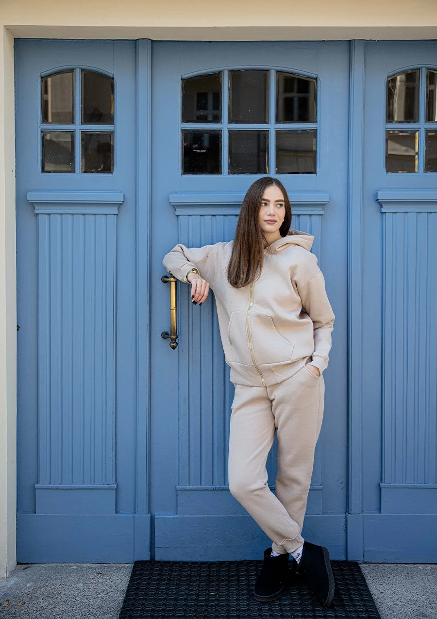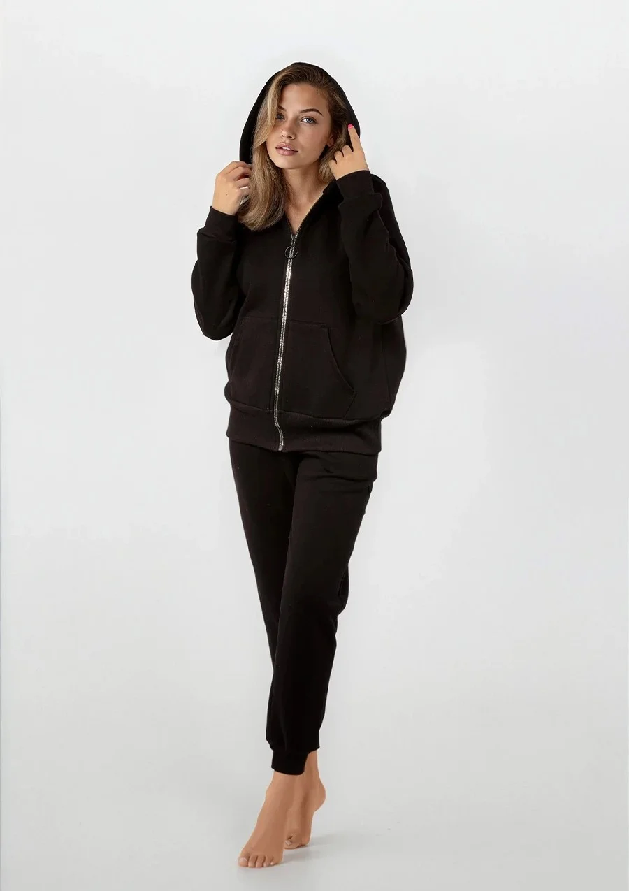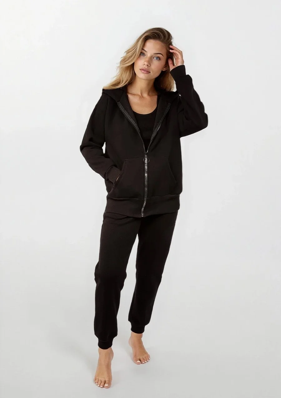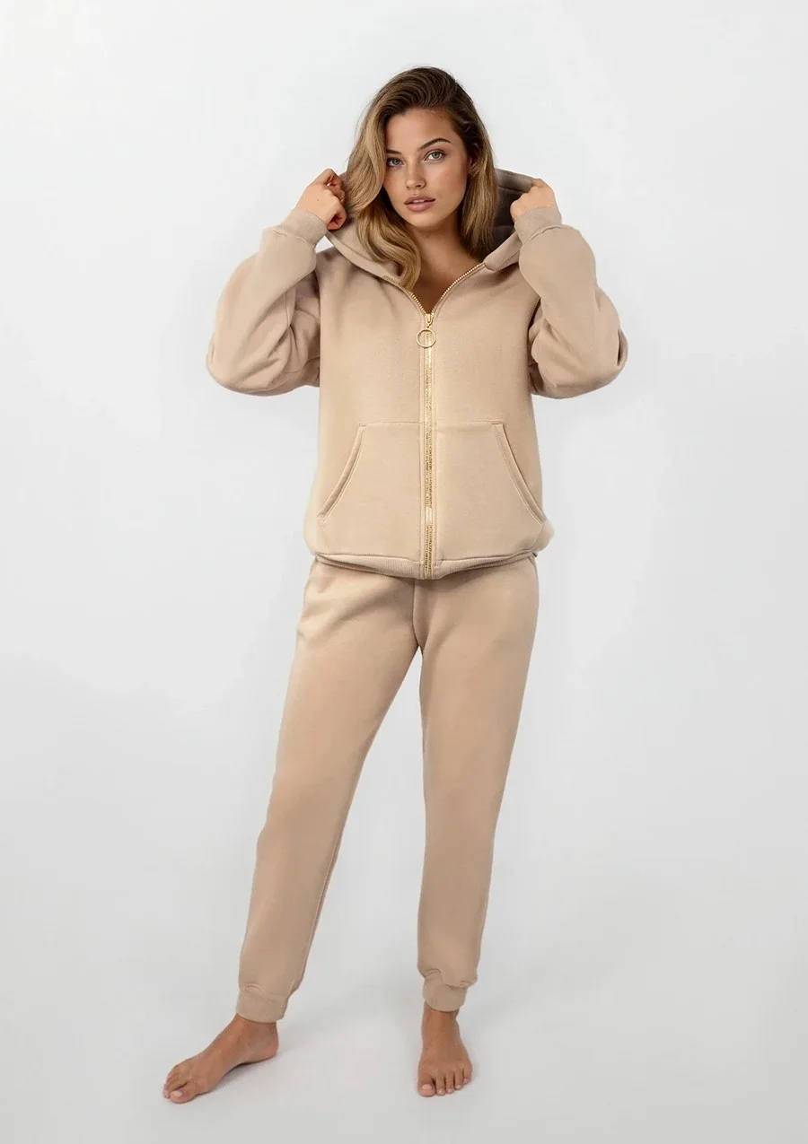 Komplet to doskonałe połączenie stylu i wygody, idealne na każdą okazję. Składający się z grubej bluzy rozpinanej z kapturem oraz spodni, zestaw ten jest niezastąpiony dla każdego, kto ceni sobie komfort i modny wygląd.