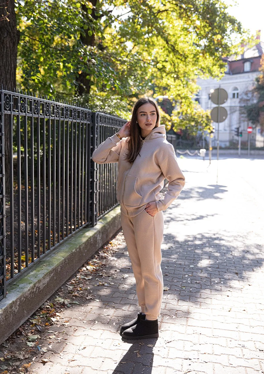 Bluza i spodnie dostępne w kolorach, takich jak cappuccino, czarny, ecru i fuksja, co daje możliwość dopasowania do indywidualnych preferencji i stylu. Dzięki swojemu wykonaniu, doskonale sprawdzą się podczas weekendowych wyjazdów, spacerów czy treningów. Wygodny krój pozwala na noszenie podczas codziennych aktywności.