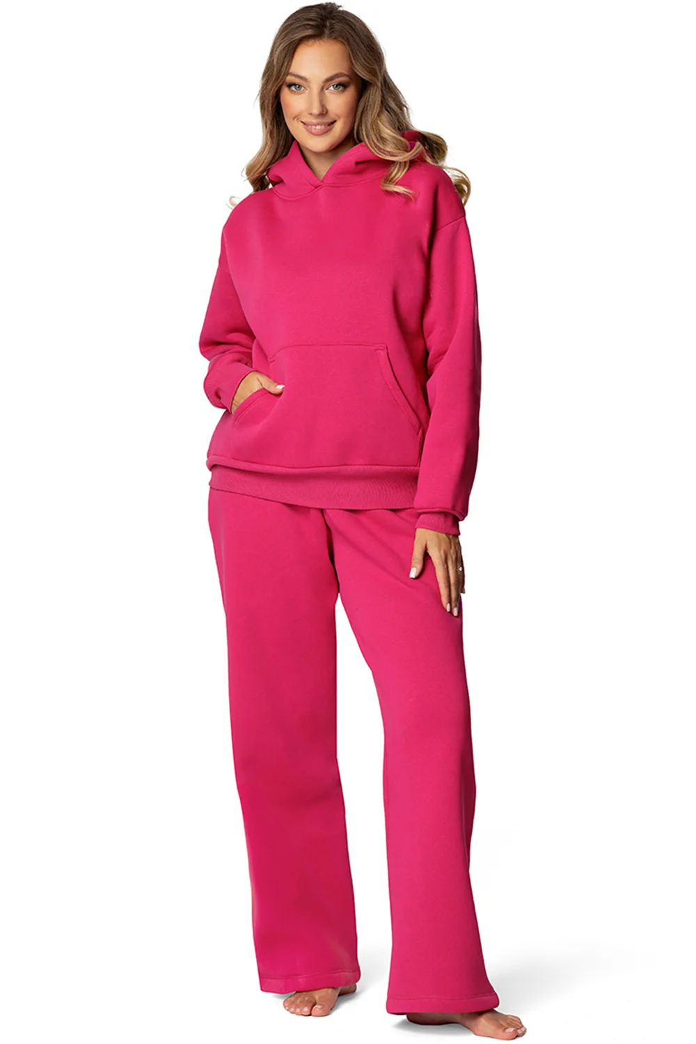 Dres składa się ze spodni o szerokich nogawkach, które zapewniają swobodę ruchu, oraz bluzy kangurki z praktycznymi kieszonkami. Spodnie są wyposażone w elastyczną gumkę w pasie, co sprawia, że idealnie dopasowują się do sylwetki i zapewniają wygodę przez cały dzień. Bluza kangurka, z charakterystyczną przednią kieszenią, jest idealna do ogrzewania rąk lub przechowywania drobnych przedmiotów.