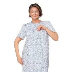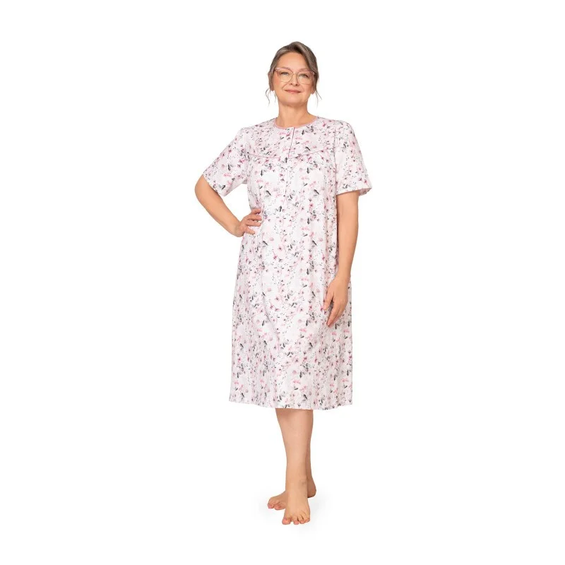 Koszula nocna z krótkim rękawem marki MARTEL. Dekolt koszuli wykończony lamówką i rewersem zapinanym na guziki . Koszula jest pokryta drobnym motywem w kwiatki. Elementem dekoracyjnym jest ozdobny ścieg na lamówce i rewersie koszuli. Produkt jest dostępny w 4 różnych kolorach. Produkt wykonano w 100 procentach z bawełny najlepszej jakości, przyjemnie miękkiej i miłej w dotyku, odpowiadającej standardom Oeko - Tex. Koszula sięga do kolana i jest idealna dla Pań ceniących wysoki komfort i jakość.
