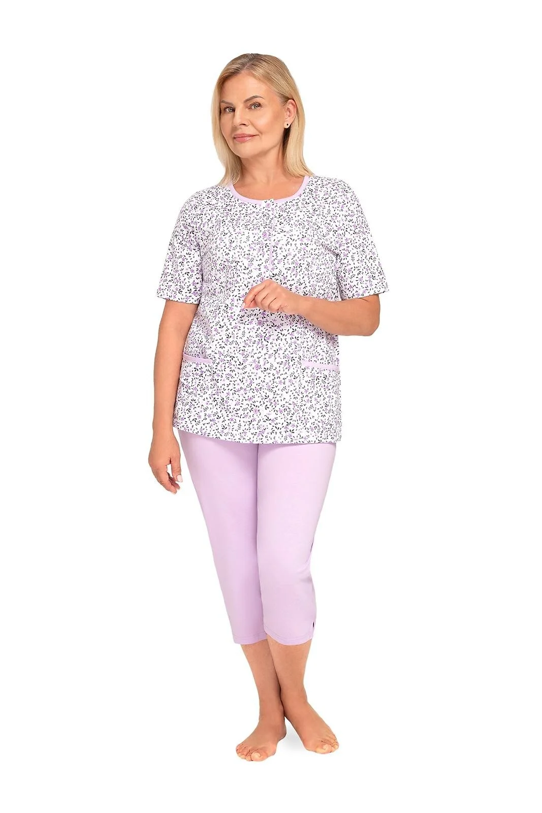 Piżama damska - wykonana z delikatnej bawełny - koszulka wzorzysta, zapinana na guziki - krótki rękaw - po bokach naszyte kieszenie - spodnie rybaczki, jednolite   Skład: 100% bawełna