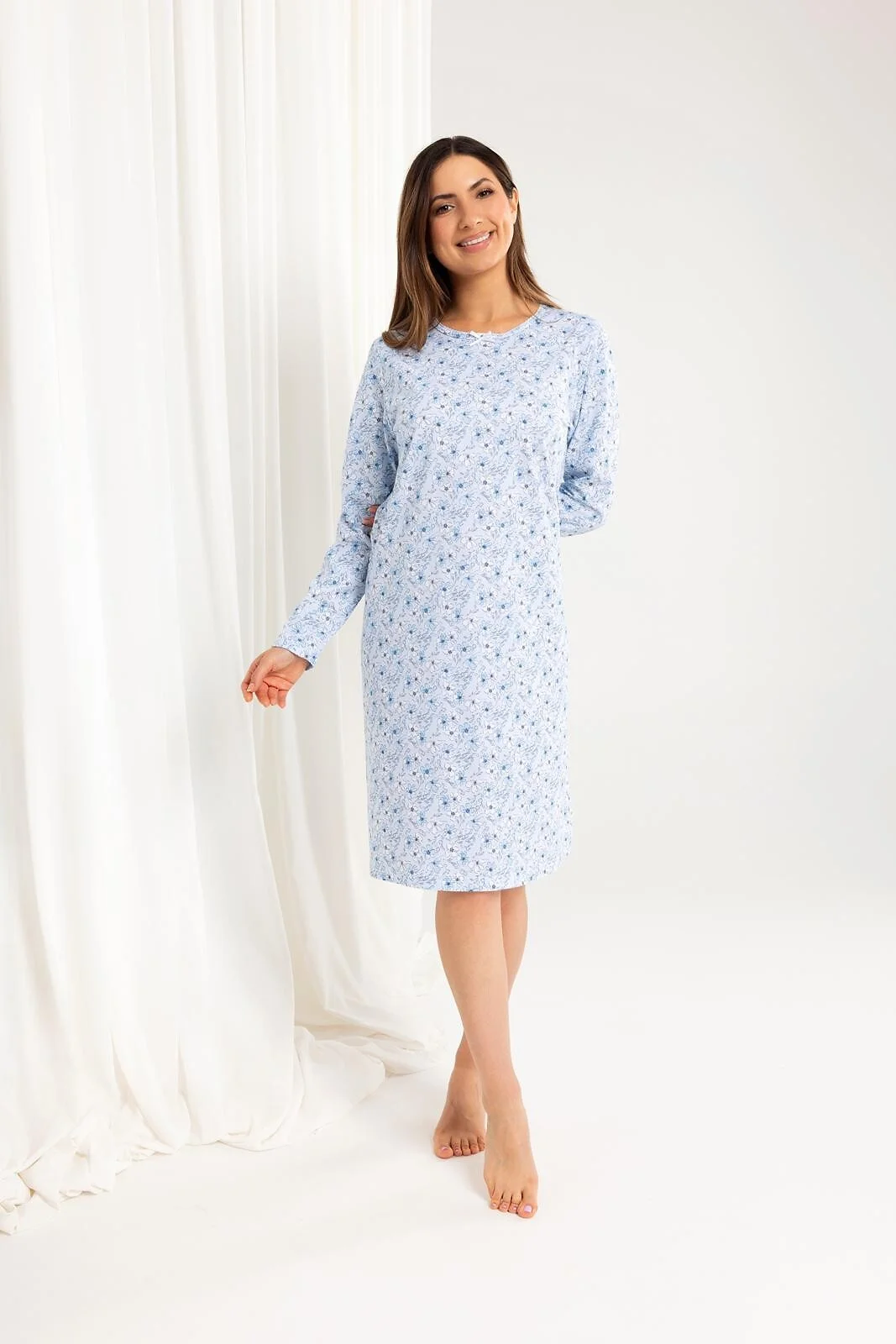 Koszula damska - wysokiej jakości bawełna w kwiatki - długi rękaw - dekolt okrągły, ozdobiony kokardką i ozdobnym obszyciem - długość do kolana   Skład: 100% bawełna