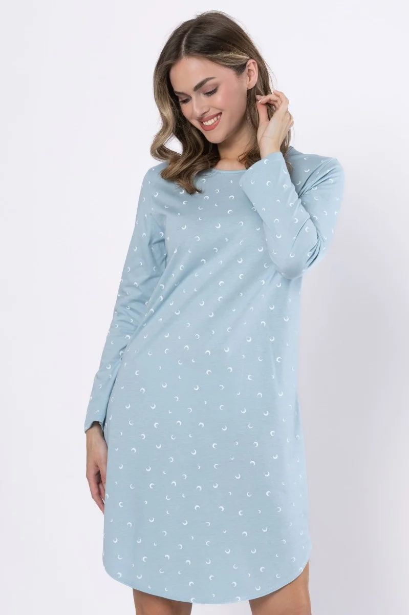 Koszula została starannie zaprojektowana z dbałością o każdy detal , długie rękawy i okrągły dekolt zapewniają wygodę i ciepło, długość przed kolano w połączeniu z zaokrąglonym dołem i delikatnymi wycięciami po bokach dodaje jej lekkości i kobiecego wdzięku.