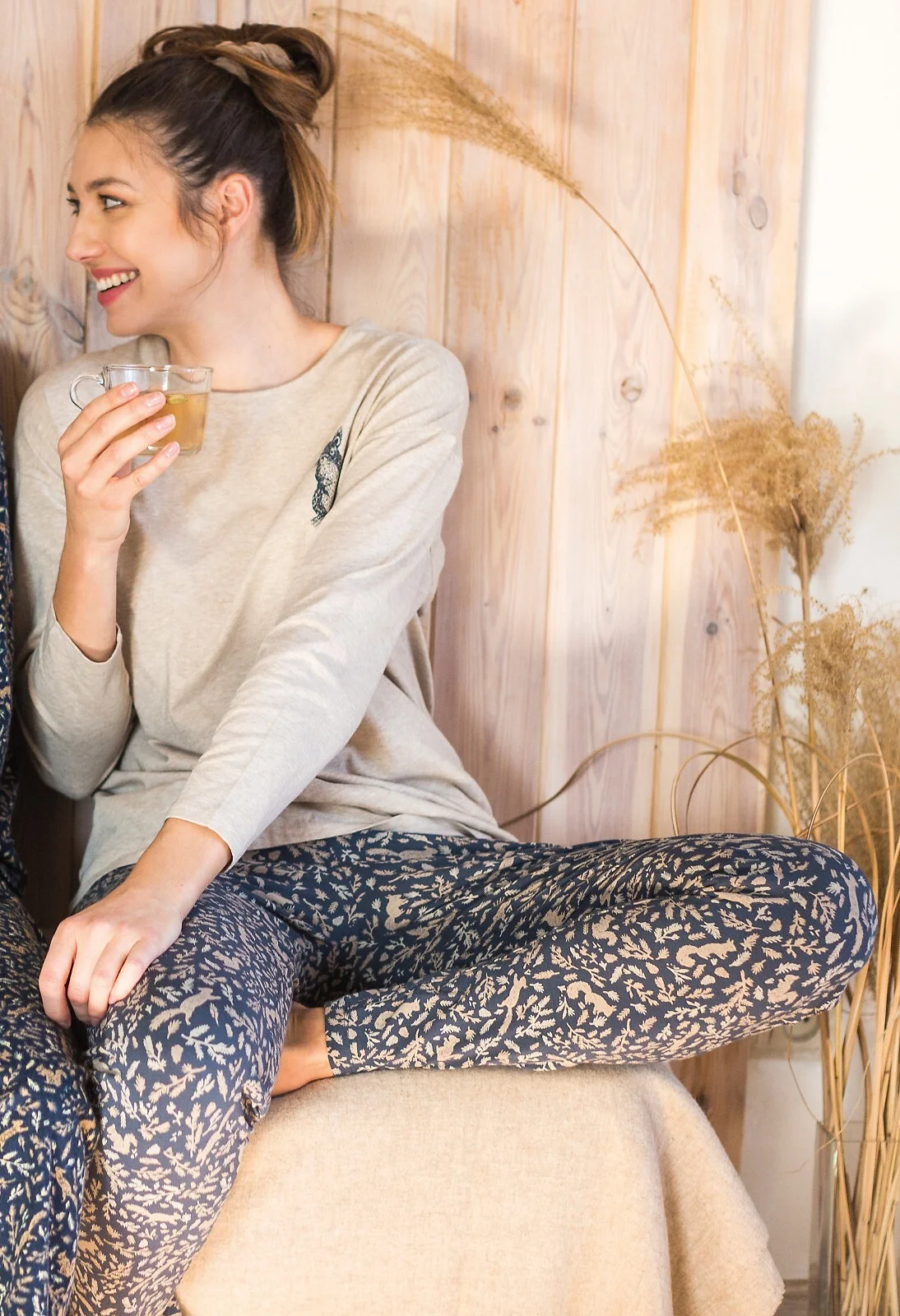 Bawełniana piżama damska - koszulka melanżowa, z długim rękawem - półokrągły dekolt - na wysokości piersi ozdobny wzór z wiewiórką - tył koszulki wydłużony - spodnie długie, wzorzyste - prosty krój nogawek - po bokach dwie kieszenie - w pasie wygodna gumka, obszyta bawełną Skład: 95% bawełna, 5% elastan