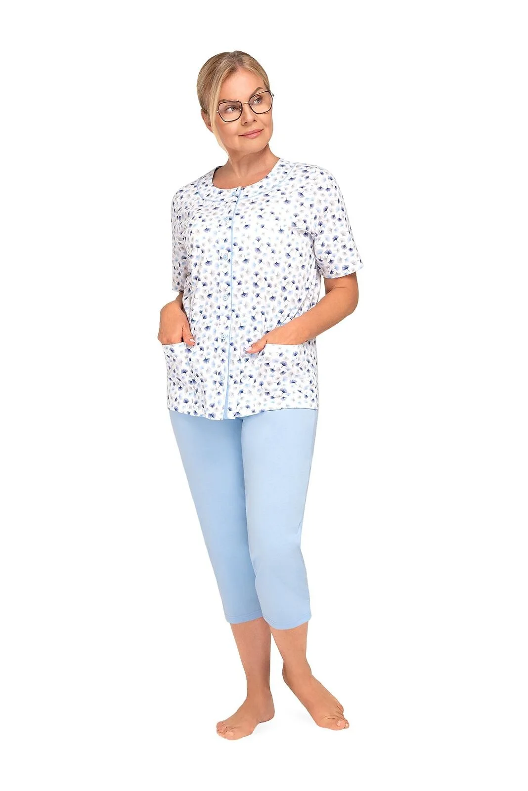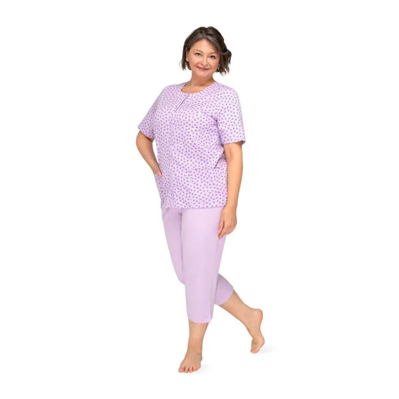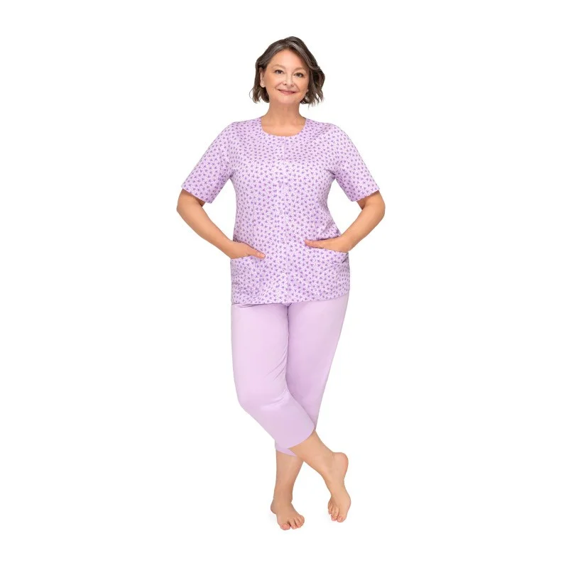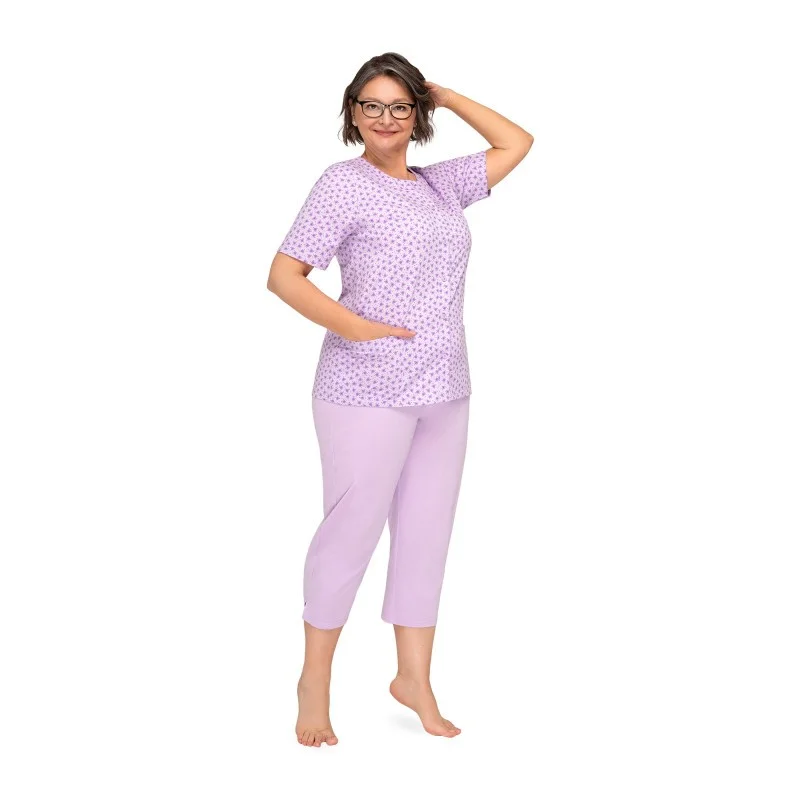 Piżama damska Martel Maria to idealny produkt dla wymagających klientek, które cenią sobie najwyższą jakość i wygodę. Wykonana została z miękkiej, wysokogatunkowej i miłej w dotyku bawełny, a spodnie wykończono w pasie elastyczną gumką. Gwarantuje to nie tylko wysoki komfort użytkowania, ale także możliwość dobrego dopasowania rozmiaru. Krótki rękaw i nogawki o długości 3/4 nadają się idealnie na wiosenno-letnie wieczory, a stonowane kolory i delikatne wzory w kwiaty lub liście pięknie podkreślają kobiecą urodę.