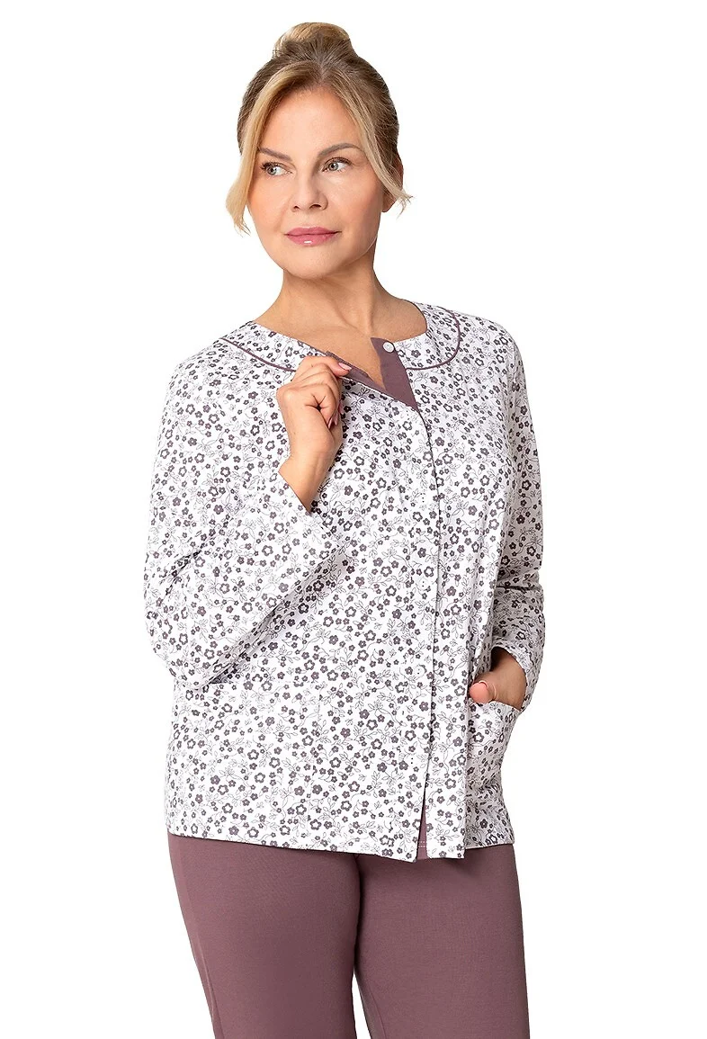 Nie ma to jak piżama damska. Strój na noc złożony jest z bluzki z długim rękawem oraz długich spodni. Góra piżamy jest wzorzysta, dekorowana motywem listków, zdobiona lamówką. Bluza jest rozpinana, wzorzysta, a spodnie są gładkie, z gumką w pasie. Piżama jest wygodna, komfortowa, dopasowana do sylwetki. Bawełna, z której wykonano tę piżamę, jest bardzo dobrego gatunku. Warto nabyć ten strój i nosić go codziennie wieczorem. Spanie w tej piżamie jest komfortowe, można czuć się w niej wygodnie, luźno, bezpretensjonalnie. Strój oferowany jest w wielu rozmiarach oraz kolorach.