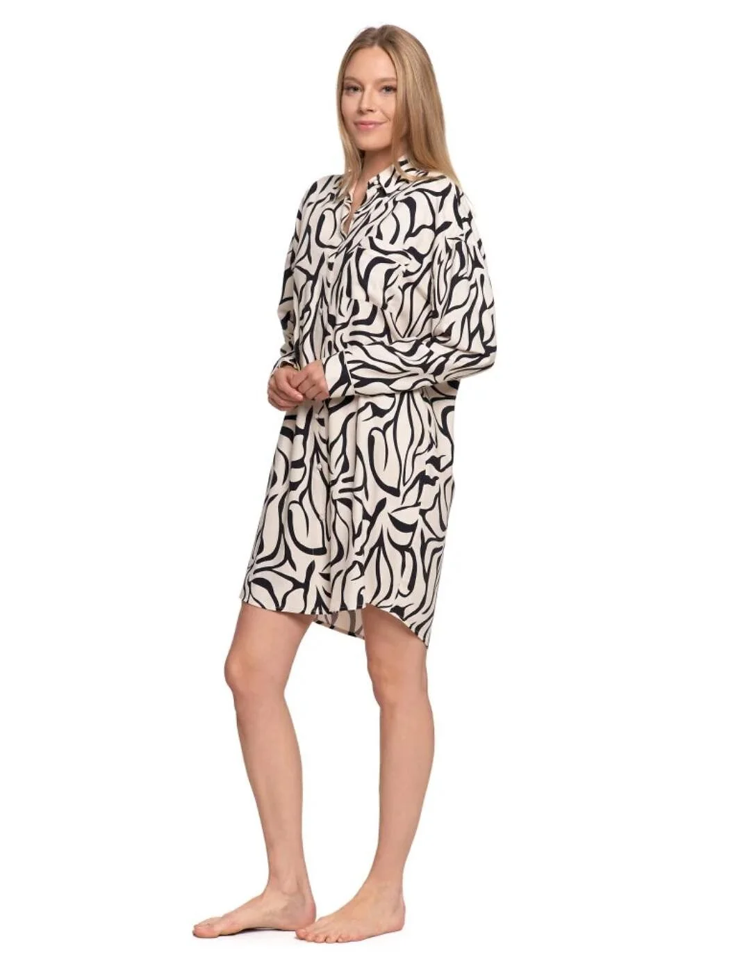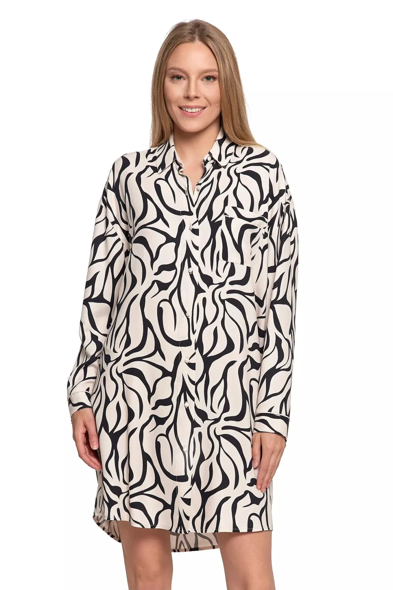 Elegancka, damska koszula nocna - łączy w sobie wyjątkowy komfort i styl - wykonana w 100% z lekkiej, oddychającej wiskozy - zapewnia niezwykłą miękkość i przewiewność - idealną na każdą porę roku - klasyczny, koszulowy krój z długimi rękawami i zapięciem na guziki - dodaje elegancji i sprawia, że jest niezwykle wygodna w noszeniu - delikatnie przedłużony tył oraz luźny fason subtelnie podkreślają sylwetkę - pakowana w foliowy woreczek Skład: 100% wiskoza