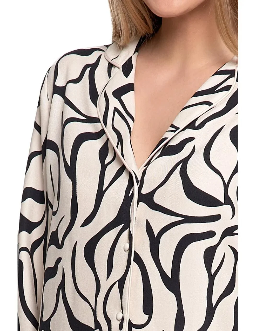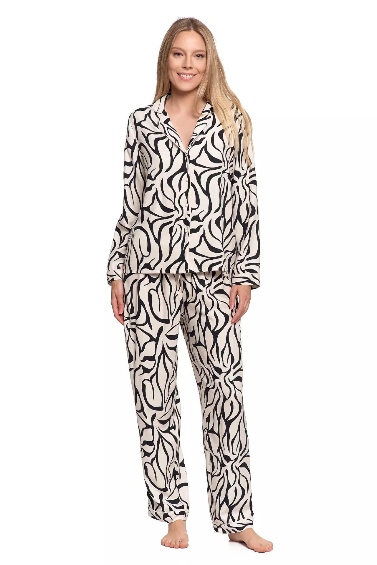 Stylowa i komfortowa piżama damska - wykonana w 100% z wiskozy - idealny wybór dla kobiet ceniących naturalne materiały i elegancki wygląd - lekka, przewiewna tkanina doskonale sprawdza się przez cały rok - koszula z długim rękawem, klasycznym kołnierzykiem, zapinana na guziki - proste, luźne spodnie zapewniają pełną swobodę ruchów - w pasie wygodna gumka Skład: 100% wiskoza