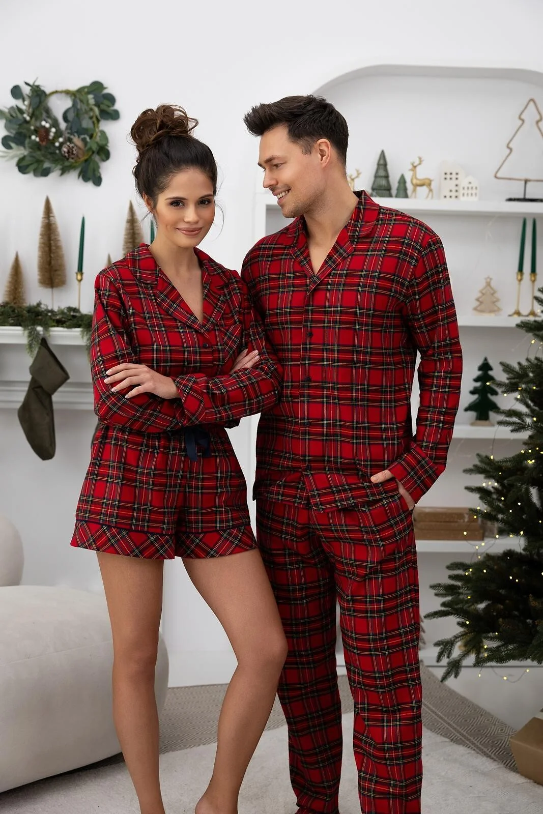 Piżama damska - wysokiej jakości bawełniana flanela - print w kratkę - bluza z długim rękawem - z kołnierzykiem, zapinana na guziki - krótkie spodenki - w pasie gumka obszyta bawełną z troczkiem do wiązania kokardki   Skład: 100% bawełna