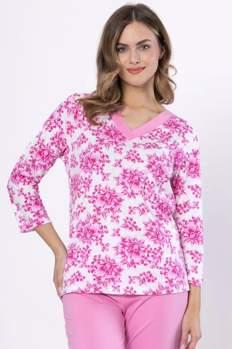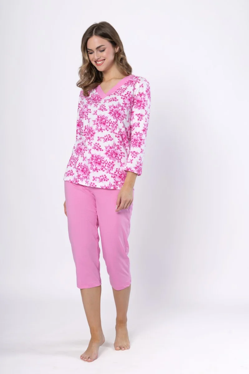 Piżama damska wykonana z wysokiej jakości bawełny. Góra wzorzysta z obszytym dekoltem pod kolor spodni. Do kompletu spodnie w jednolitym kolorze o długości za kolano.