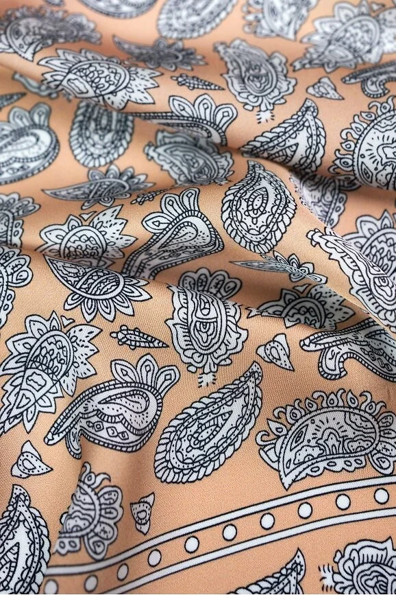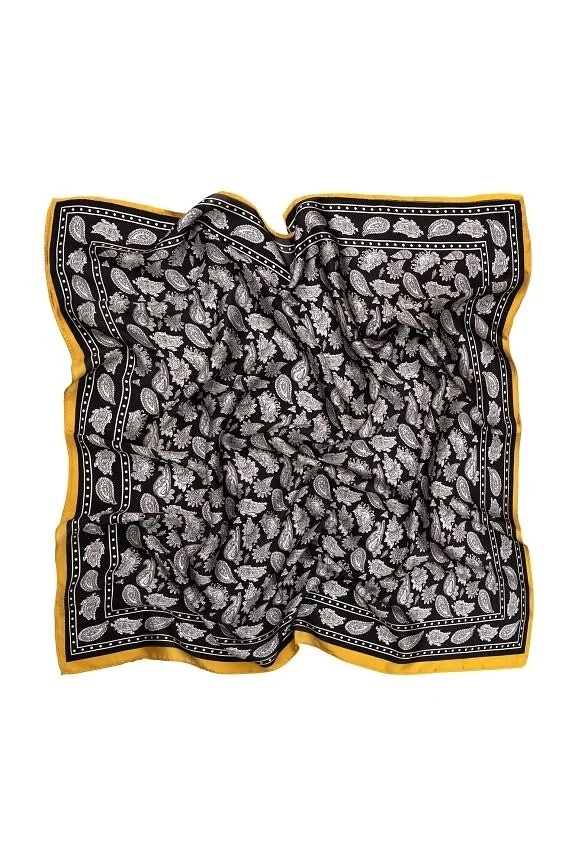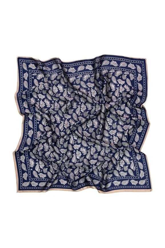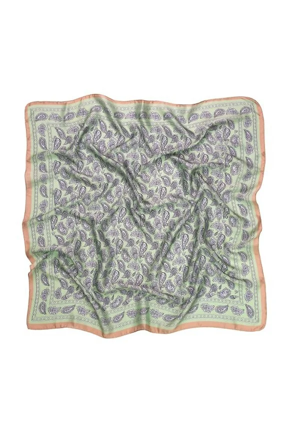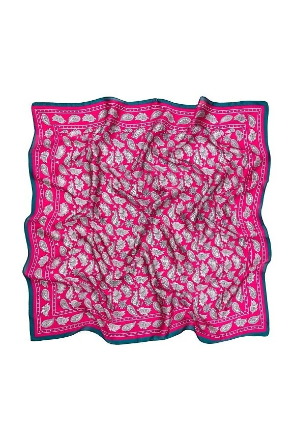 Kwadratowa apaszka z satyny - miękka, delikatnie połyskująca tkanina - z motywem paisley - przyjemna w noszeniu, łatwo układa się na szyi, włosach czy przy torebce   Skład: 100% poliester