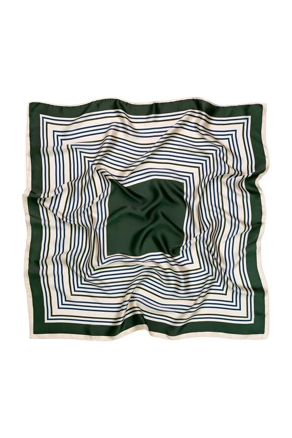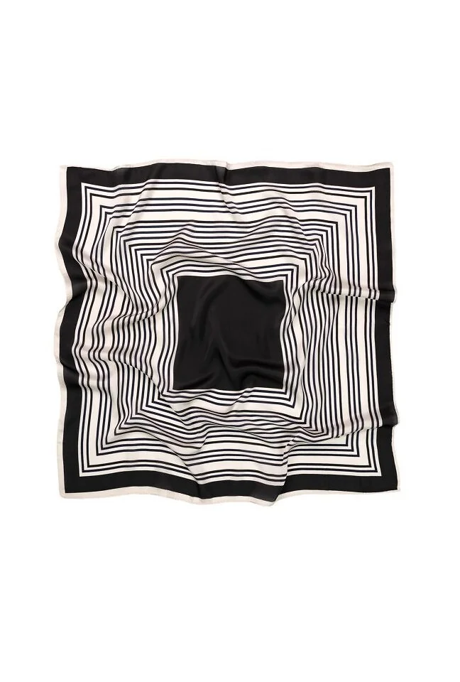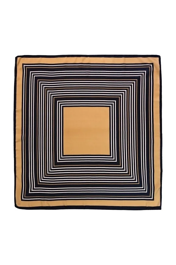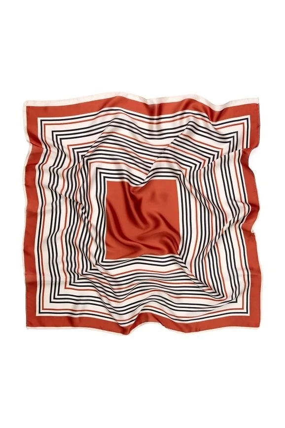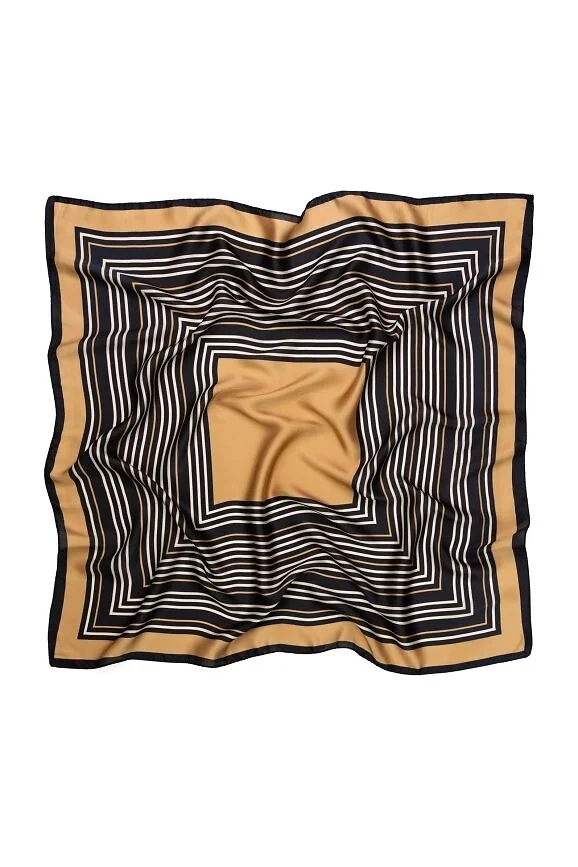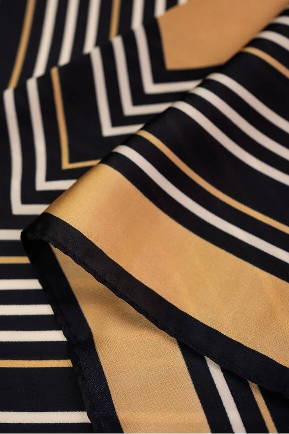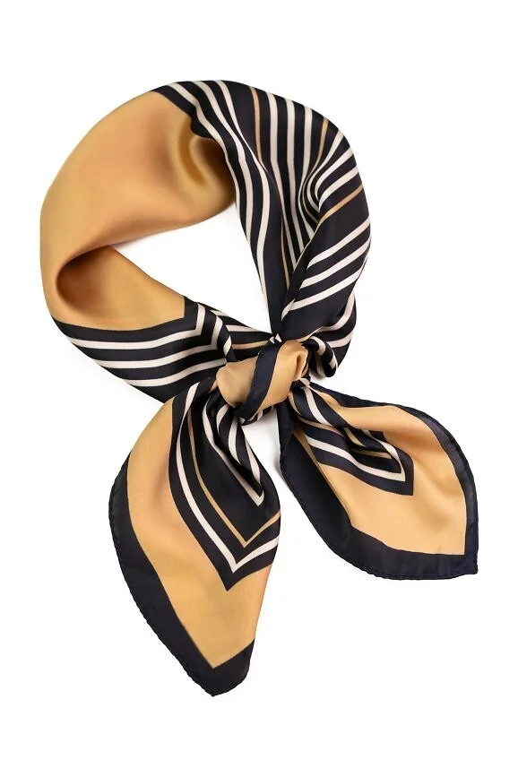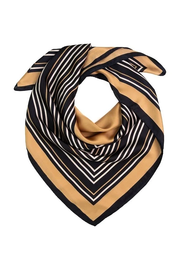 Kwadratowa satynowa apaszka - delikatnie połyskująca, miękka tkanina w dwukolorowe paski - klasyczny i elegancki dodatek - zapewnia komfort noszenia i subtelny akcent w codziennych i eleganckich zestawieniach Skład: 100% poliester