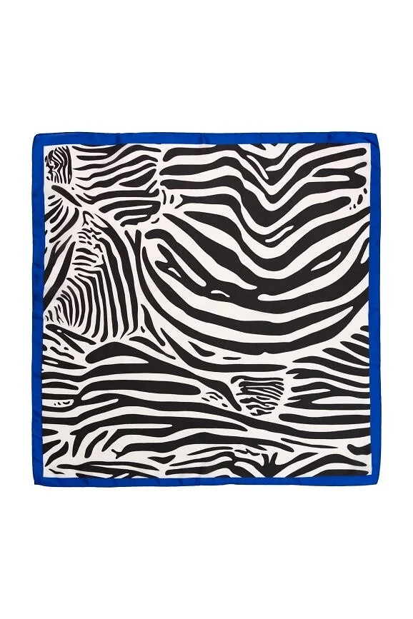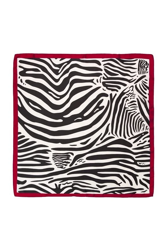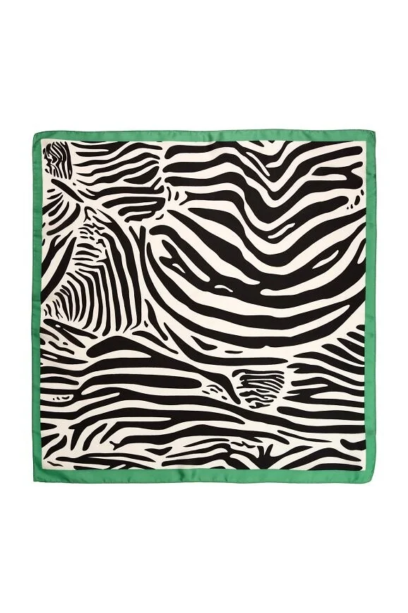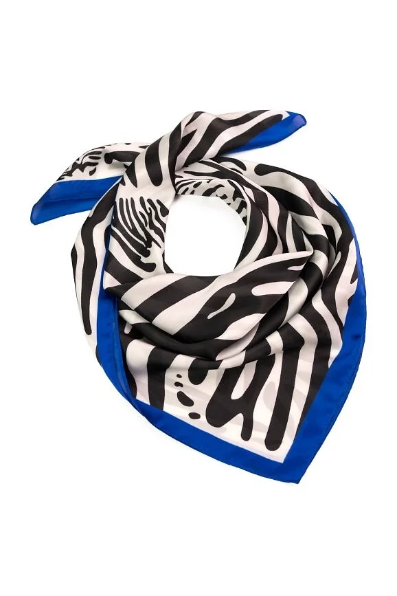 Kwadratowa satynowa apaszka - delikatnie połyskująca, miękka tkanina - wzór zebry - klasyczny i elegancki dodatek - zapewnia komfort noszenia i subtelny akcent w codziennych i eleganckich zestawieniach Skład: 100% poliester