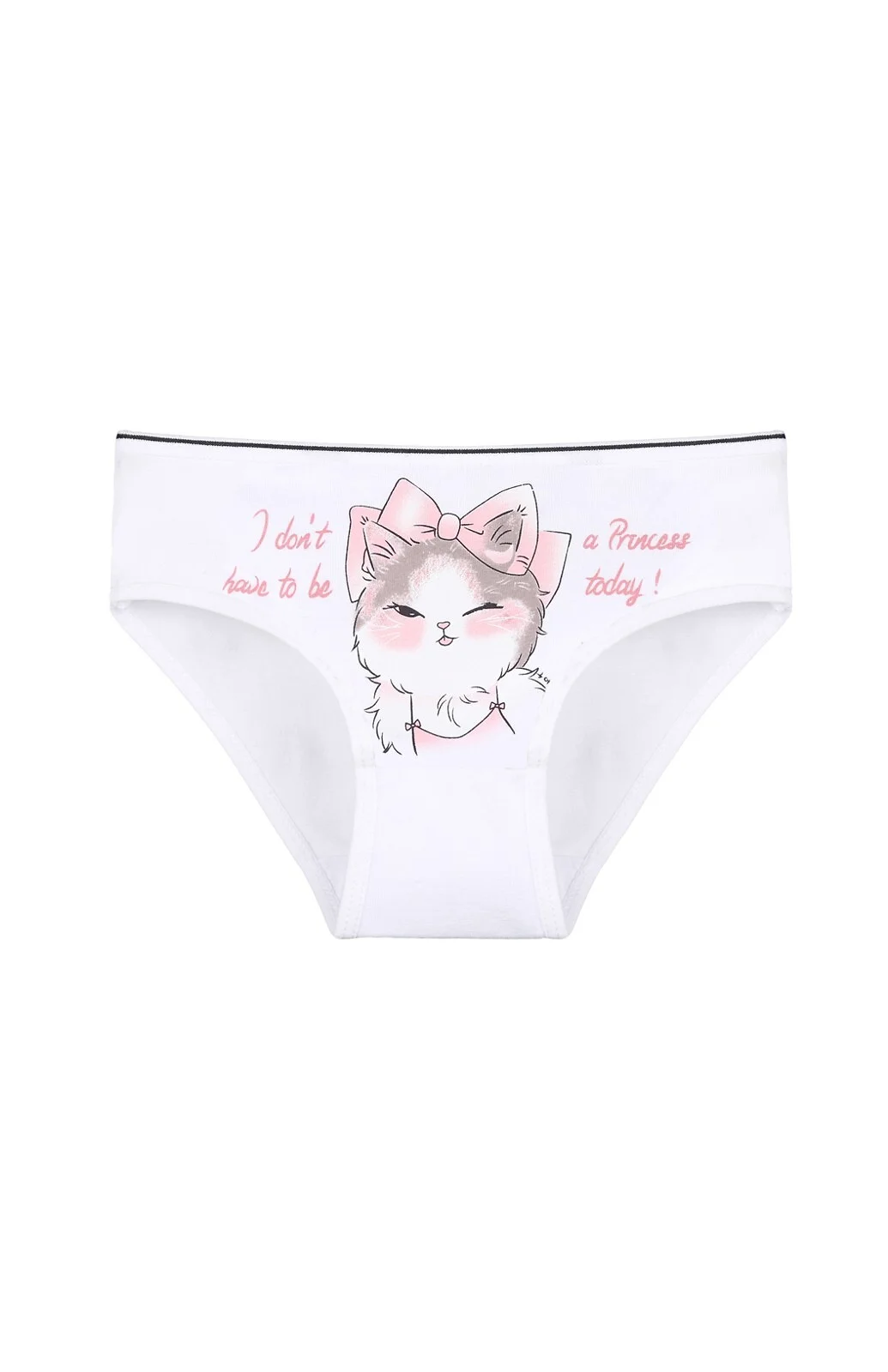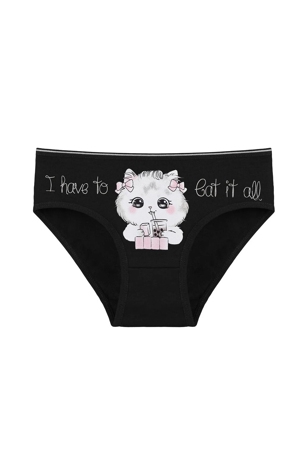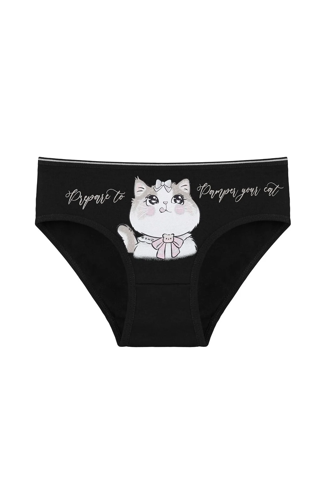 Bawełniane figi dziewczęce - z przodu kolorowy nadruk z kotkiem - pakowane po trzy sztuki w foliowy woreczek w różnych zestawieniach kolorystycznych - dostępne kolory: różowy, czarny, biały   Skład: 95% bawełna, 5% elastan