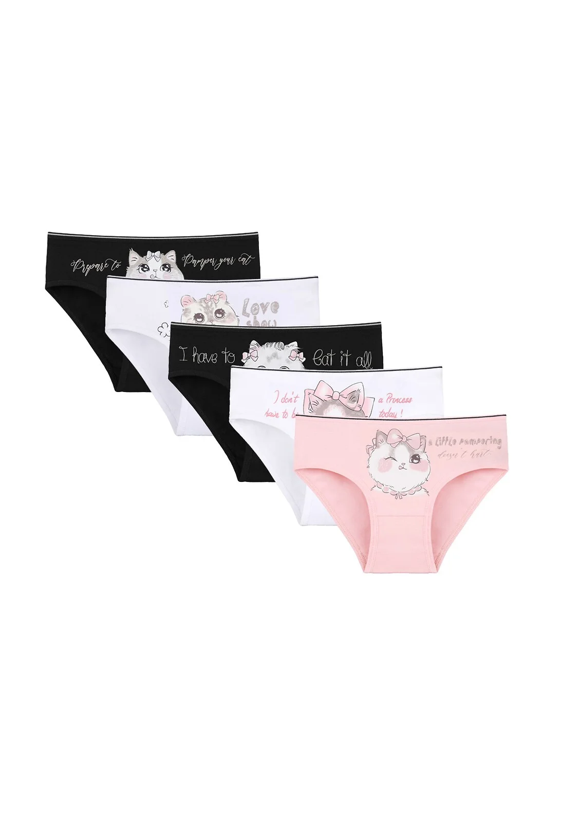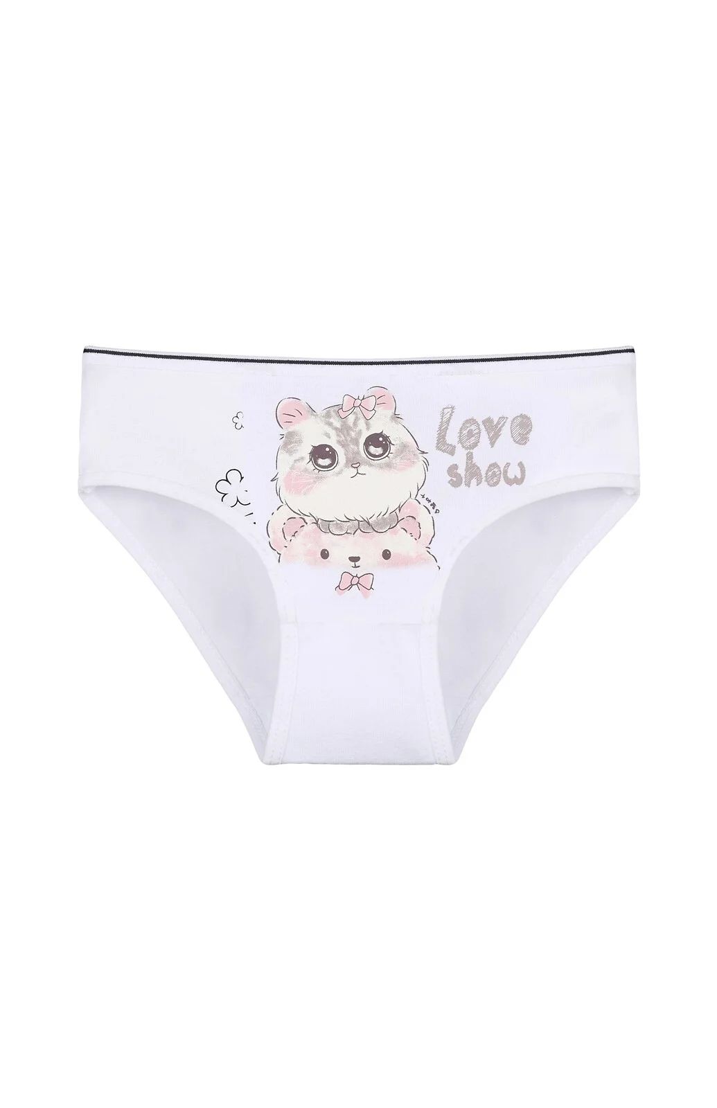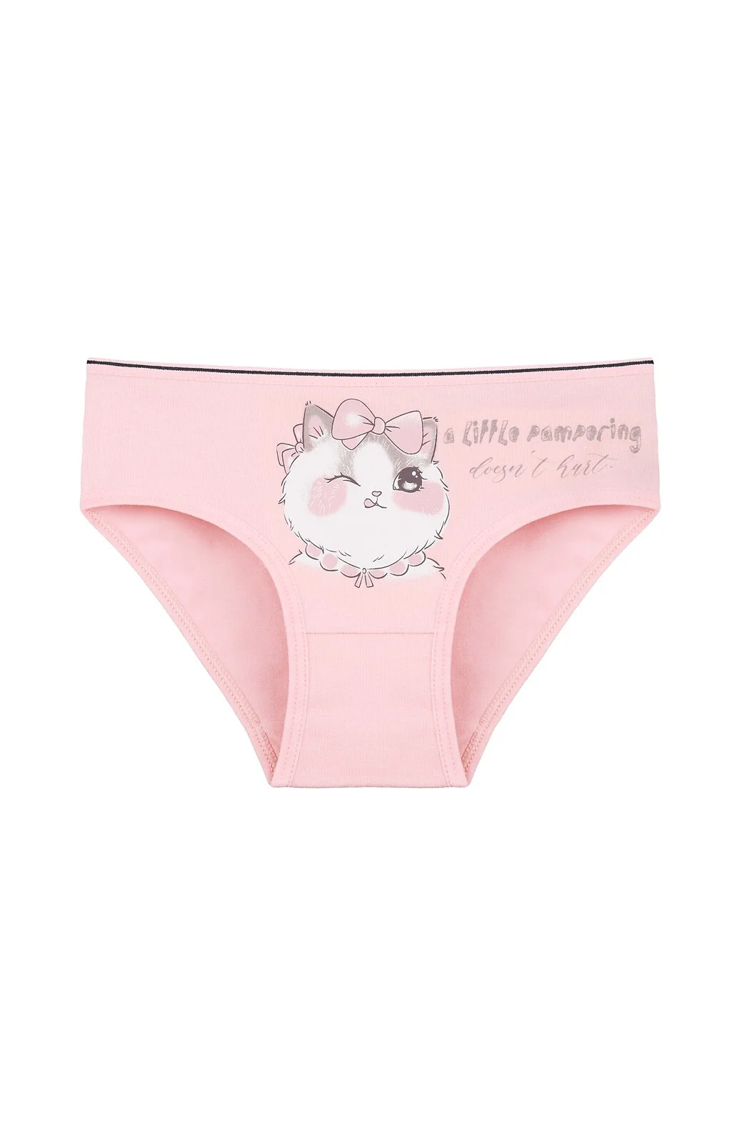 Bawełniane figi dziewczęce - z przodu kolorowy nadruk z kotkiem - pakowane po trzy sztuki w foliowy woreczek w różnych zestawieniach kolorystycznych - dostępne kolory: różowy, czarny, biały   Skład: 95% bawełna, 5% elastan