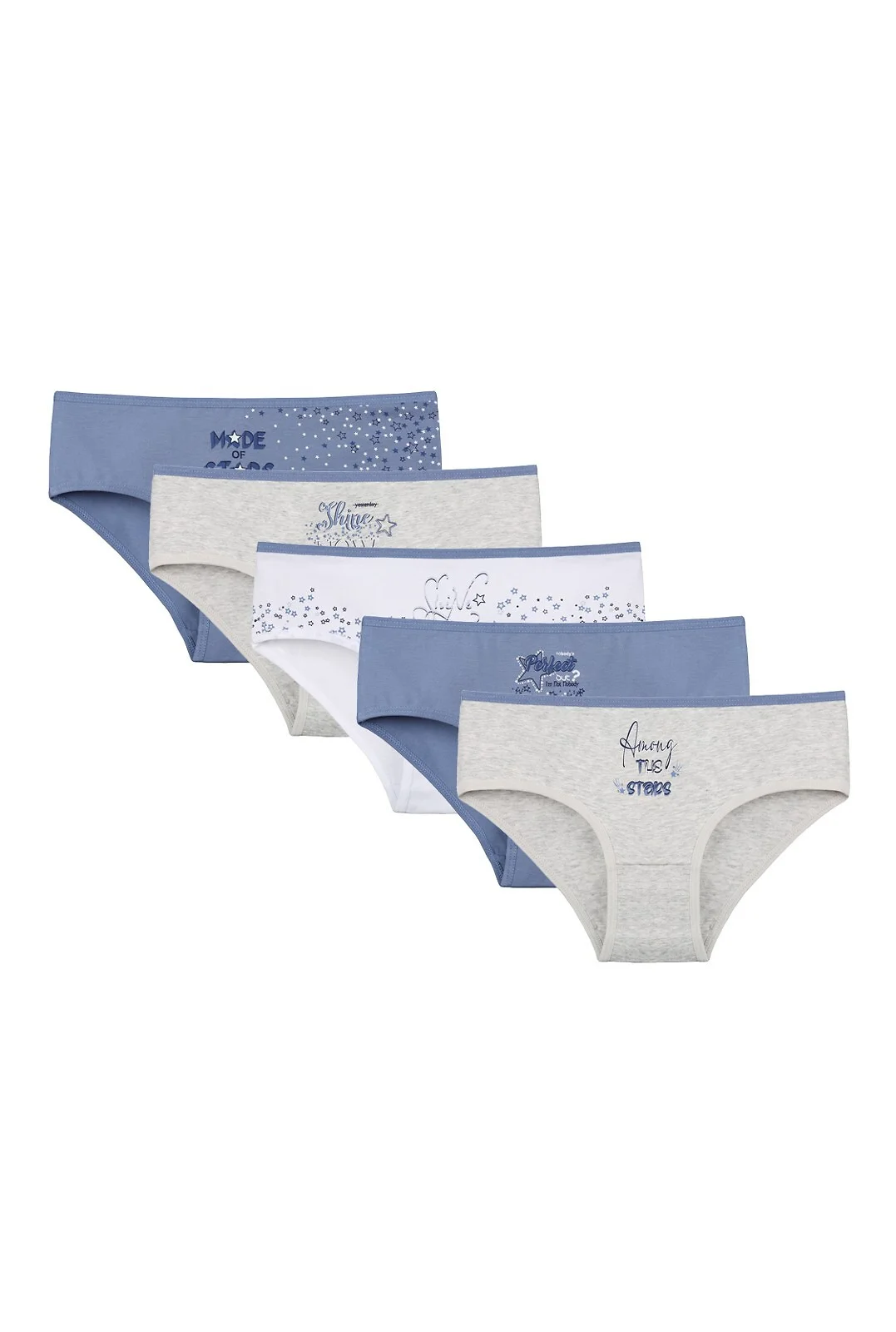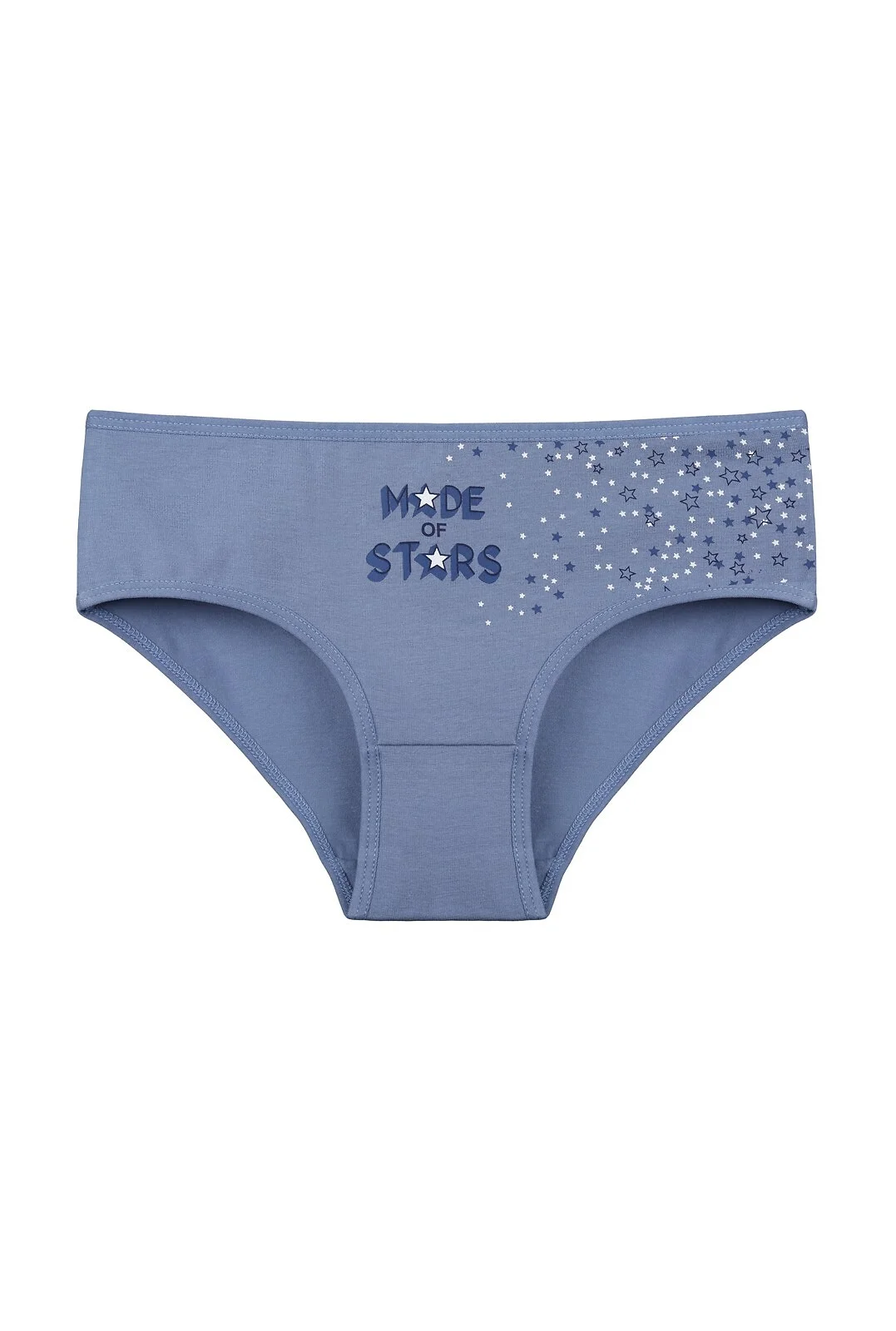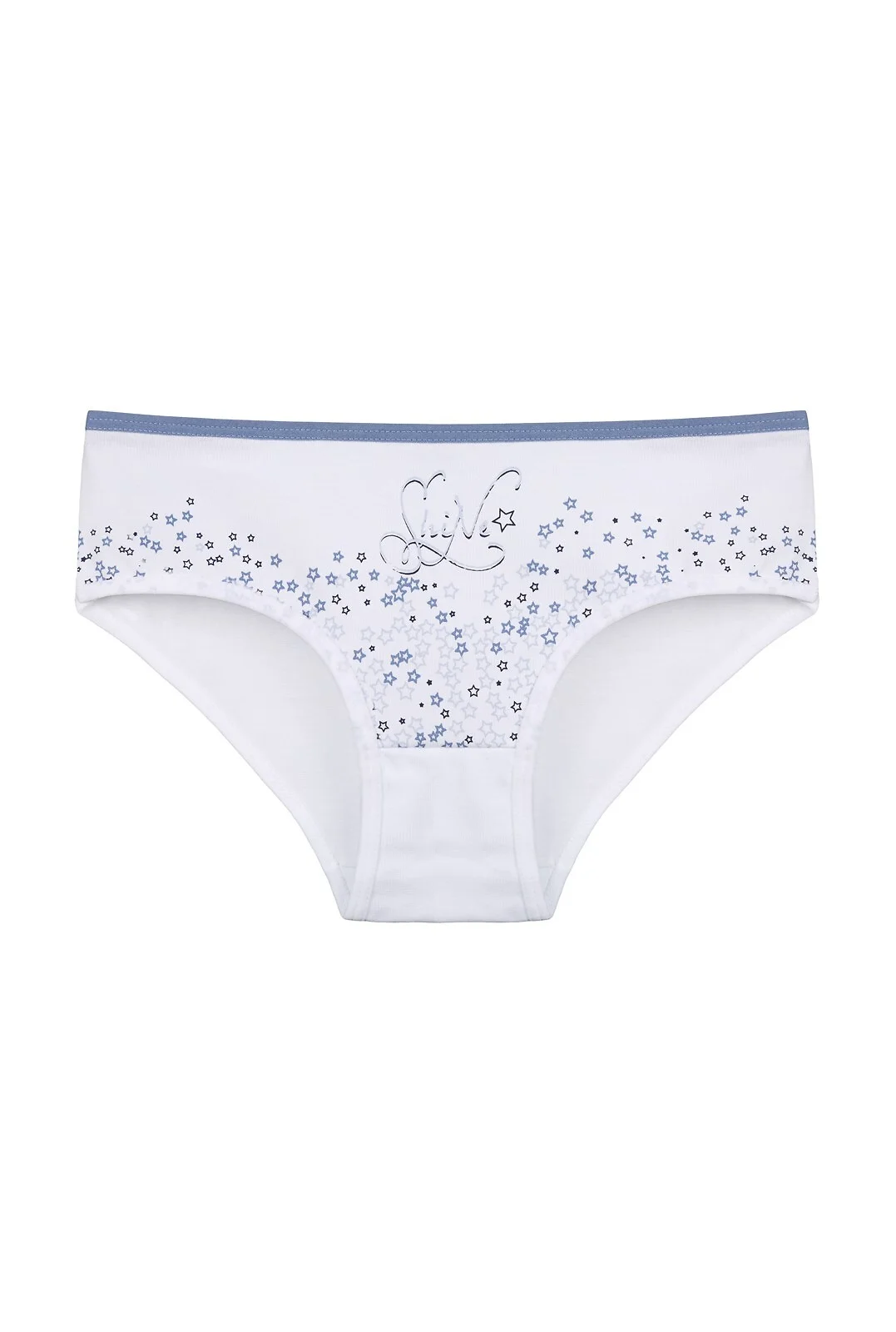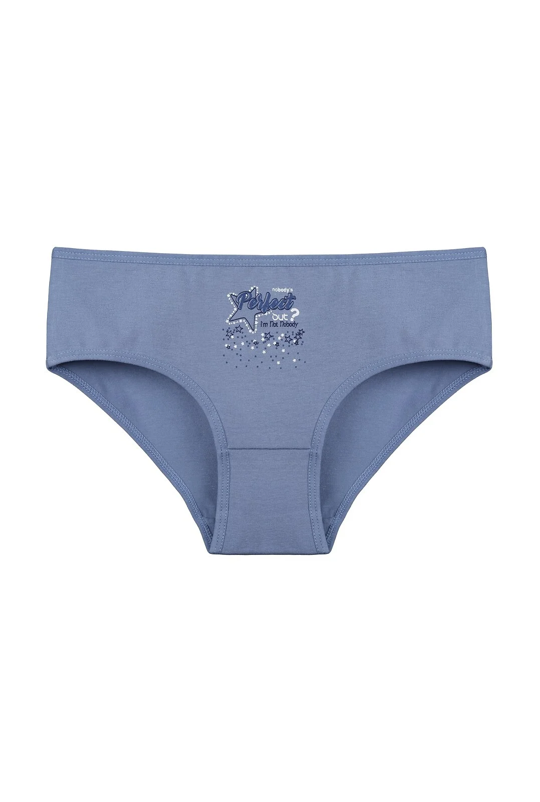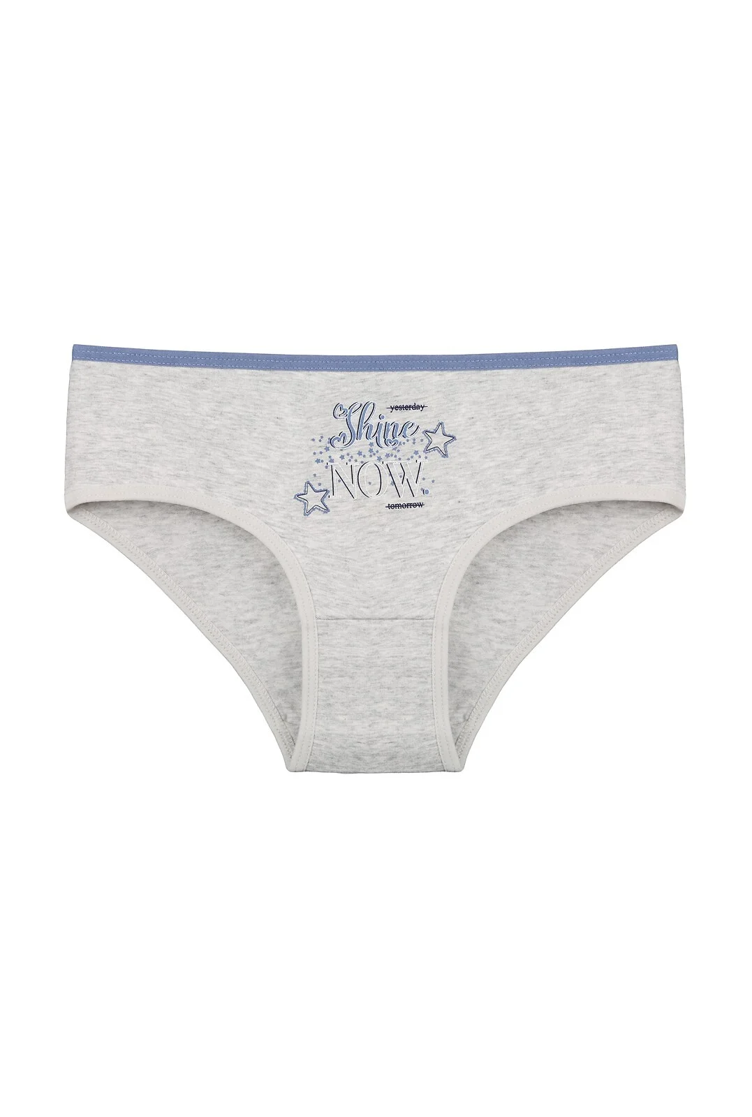 Bawełniane figi dla nastolatki - z miękkiej bawełny - z przodu ozdobne napisy - w pasie płaska gumka - pakowane po dwie sztuki w foliowy woreczek w różnych zestawieniach kolorystycznych - dostępne kolory: szary, biały, jeans Skład: 95% bawełna, 5% elastan