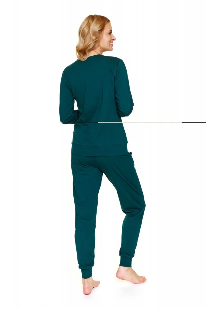 Stylowa piżama damska z czystej bawełny - wygoda w nowoczesnym wydaniu Dwuczęściowy komplet w głębokim odcieniu szmaragdowej zieleni to idealny wybór na spokojne wieczory i leniwe poranki. Góra z długim rękawem i dekoltem zapinanym na napy łączy wygodę noszenia z modnym, sportowym stylem. Spodnie wykończone elastycznymi ściągaczami dobrze układają się na sylwetce i zapewniają komfort w każdej pozycji. Najważniejsze cechy produktu: Wykonana z naturalnej, oddychającej bawełny - przyjazna dla skóry Zapinana na napy góra - funkcjonalność i estetyczny detal Ściągacze w spodniach - idealne dopasowanie bez ucisku Luźny, klasyczny fason - zapewnia swobodę ruchów Produkt polskiej produkcji - dbałość o jakość i szczegóły Dostępna w szerokiej rozmiarówce - od S do 2XL To piżama, w której poczujesz się swobodnie i stylowo - nie tylko do snu, ale też na domowe chwile relaksu.