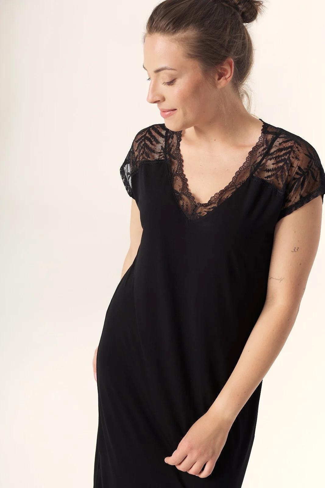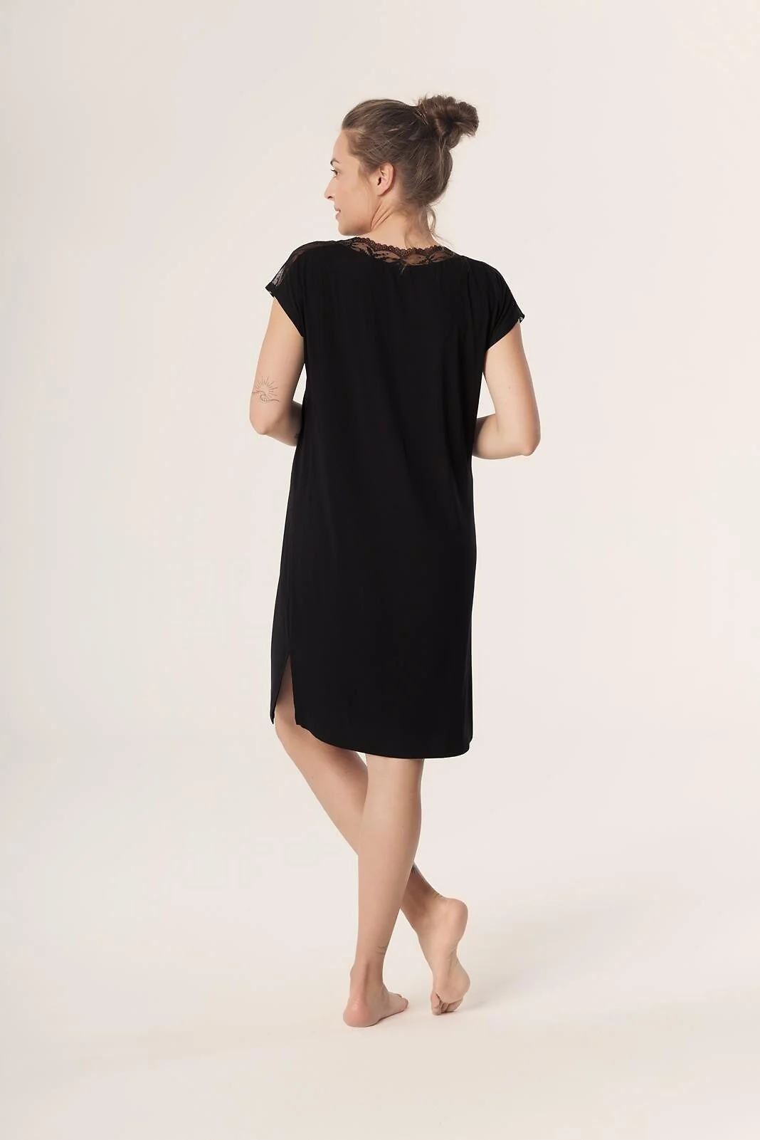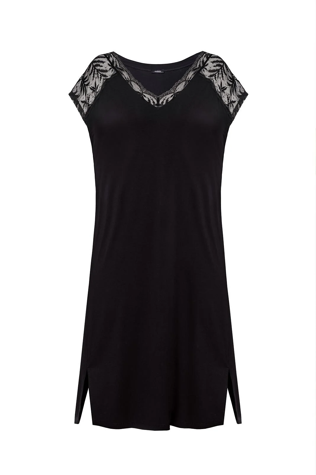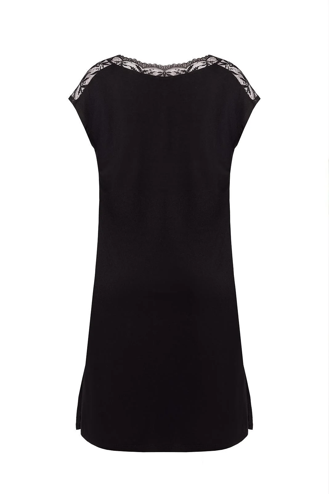 Efektowna koszulka damska - z wysokiej jakości wiskozy - dekolt "V" - dekolt i rękawki z ażurowej koronki - u dołu rozcięcia - długość przed kolano - pakowana w pudełko   Skład: 72% wiskoza, 20% poliamid, 8% elastan