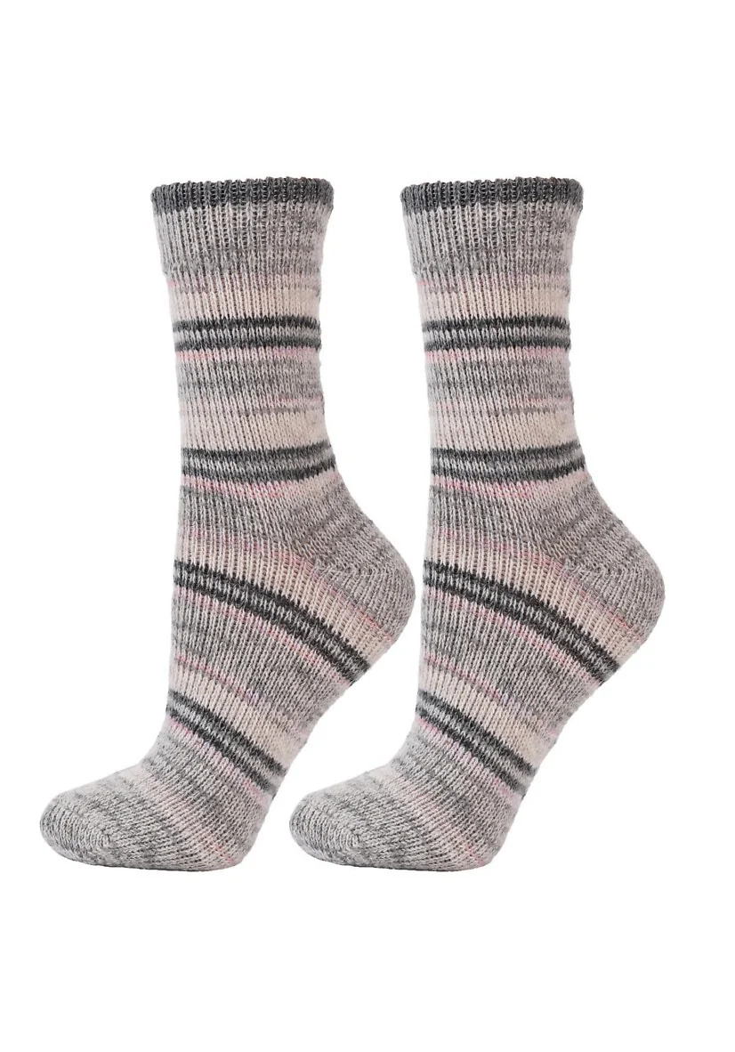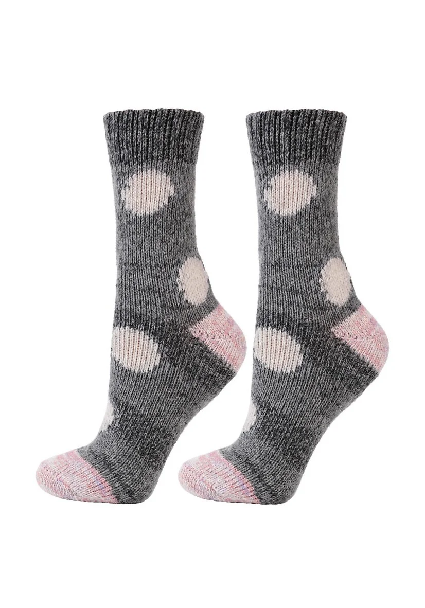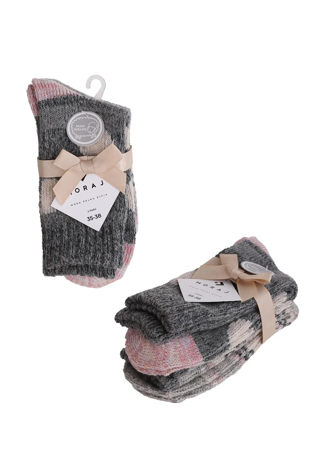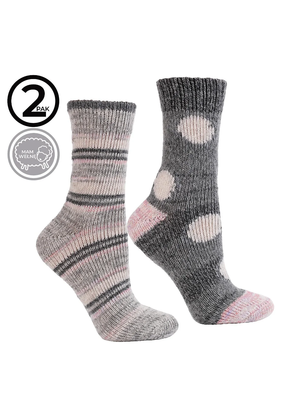 Skarpety damskie na zimę - miękka dzianina z dodatkiem wełny - wzór w groszki i paski - pakowane po dwie pary - przewiązane satynową kokardką - idealne na prezent Skład uzależniony od wzoru: groszki 63% poliester, 24% wełna, 11% akryl, 1% poliamid, 1% elastan; paski 57% poliester, 33% wełna, 8% akryl, 1% poliamid, 1% elastan