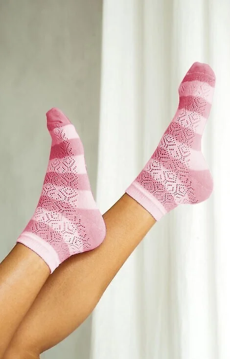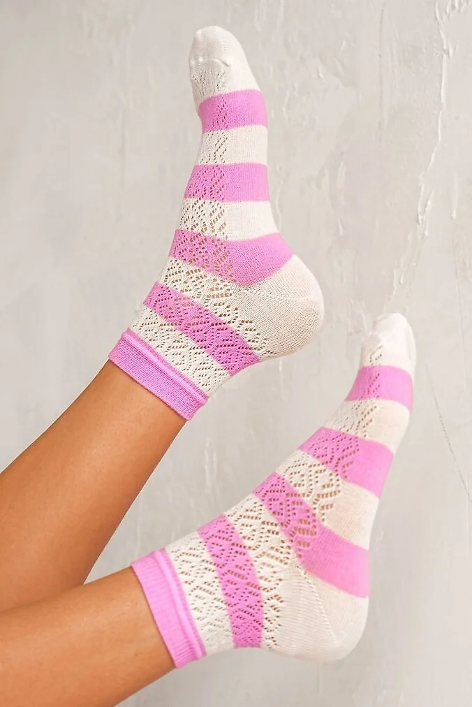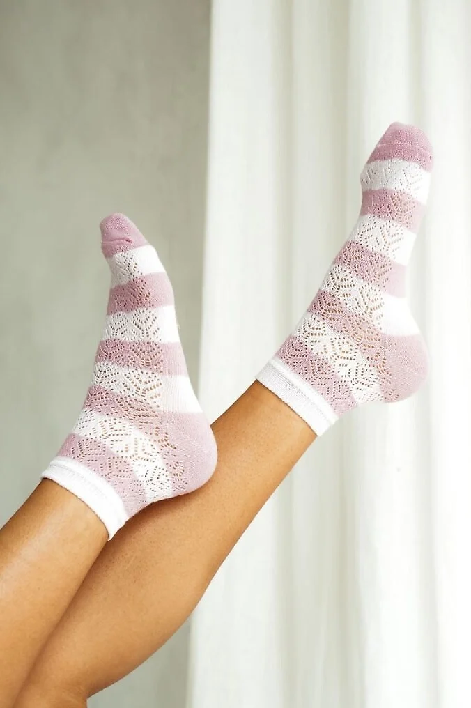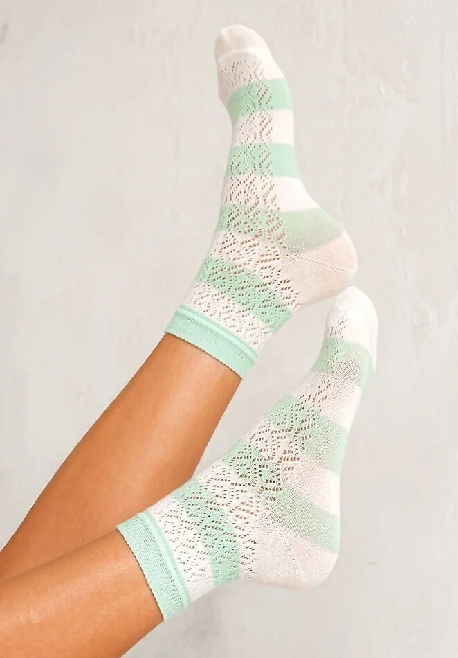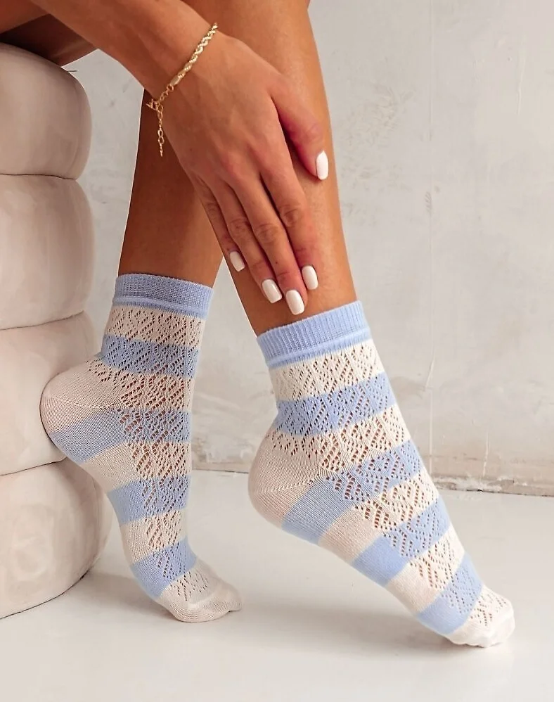 Bawełniane skarpety damskie - w paski, z ażurowym wzorem - ażurowy wzór - wyprofilowana pięta - nieuciskający ściągacz   Skład:75% bawełna, 20% poliamid, 5% elastan