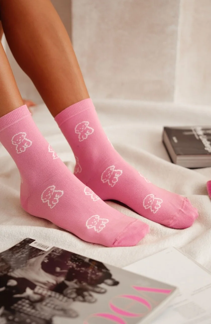 Skarpetki damskie - wykonane z wysokiej jakości bawełny - ozdobione wzorem w szczeniaczki - doskonale sprawdzą się w codziennych stylizacjach - idealnie dopasowują się do stóp - zapewniają wysoki komfort noszenia   Skład: 75% bawełna, 20% poliamid, 5% elastan
