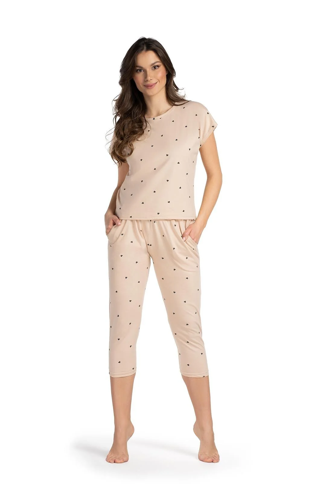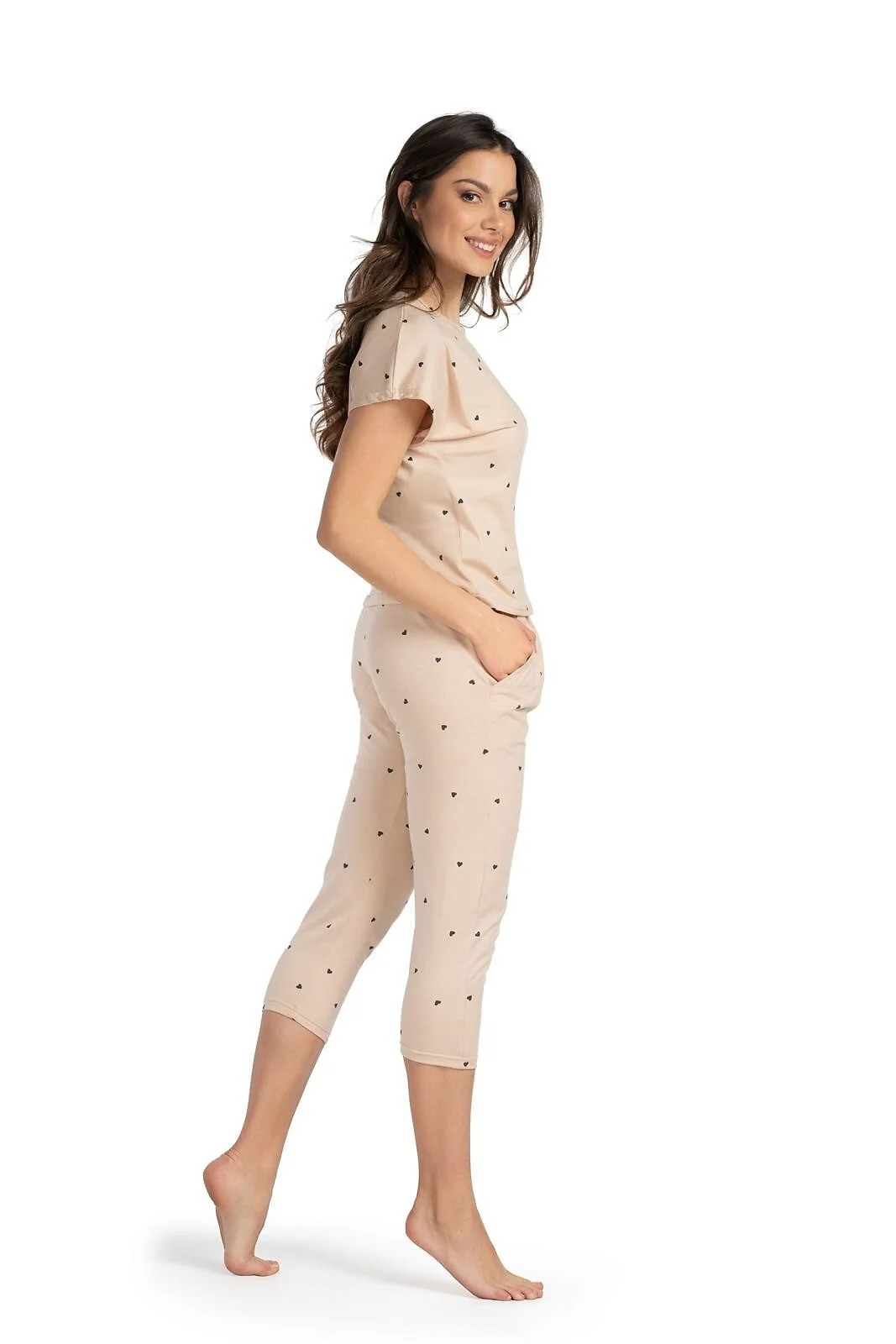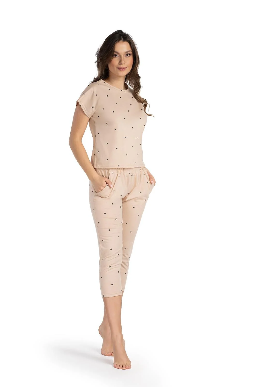 Piżama damska - wysokiej jakości bawełna - print w czarne serduszka - krótki rękaw - dekolt okrągły - spodnie o długości 7/8 - w pasie guma w tunelu - na biodrach wygodne kieszenie - pakowana w foliowy woreczek   Skład: 100% bawełna