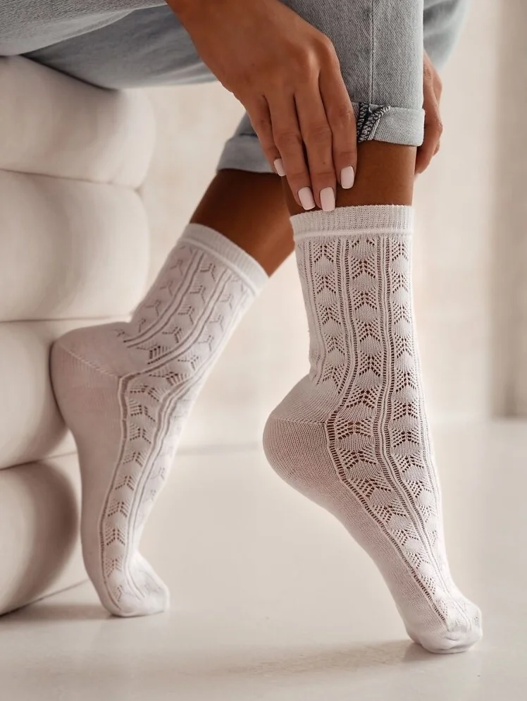 Skarpety damskie - z wyjątkowo miłej w dotyku bawełny - ozdobione cienkim, ażurowym wzorem - nieuciskający ściągacz   Skład: 84% bawełna, 14% poliamid, 2% elastan