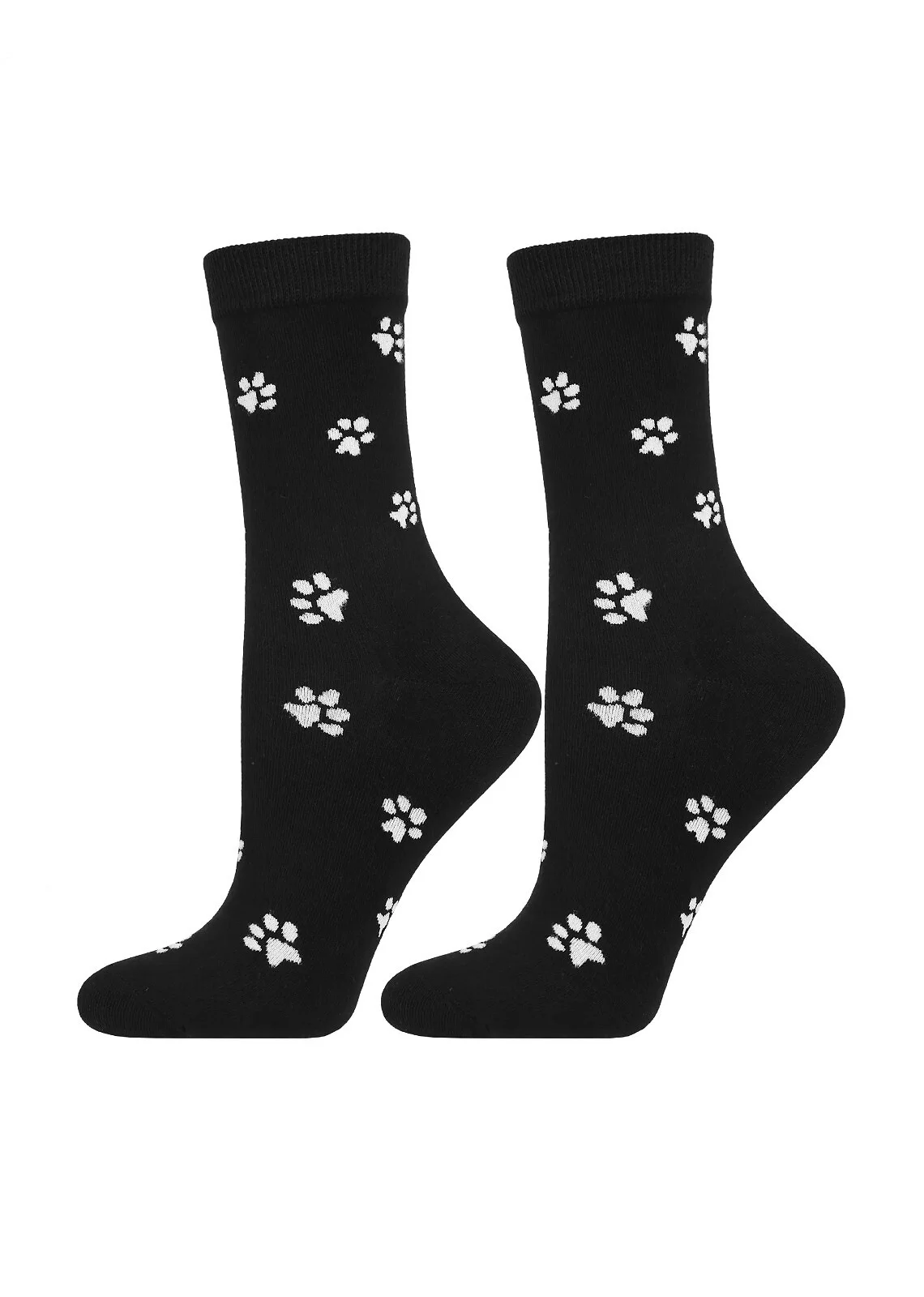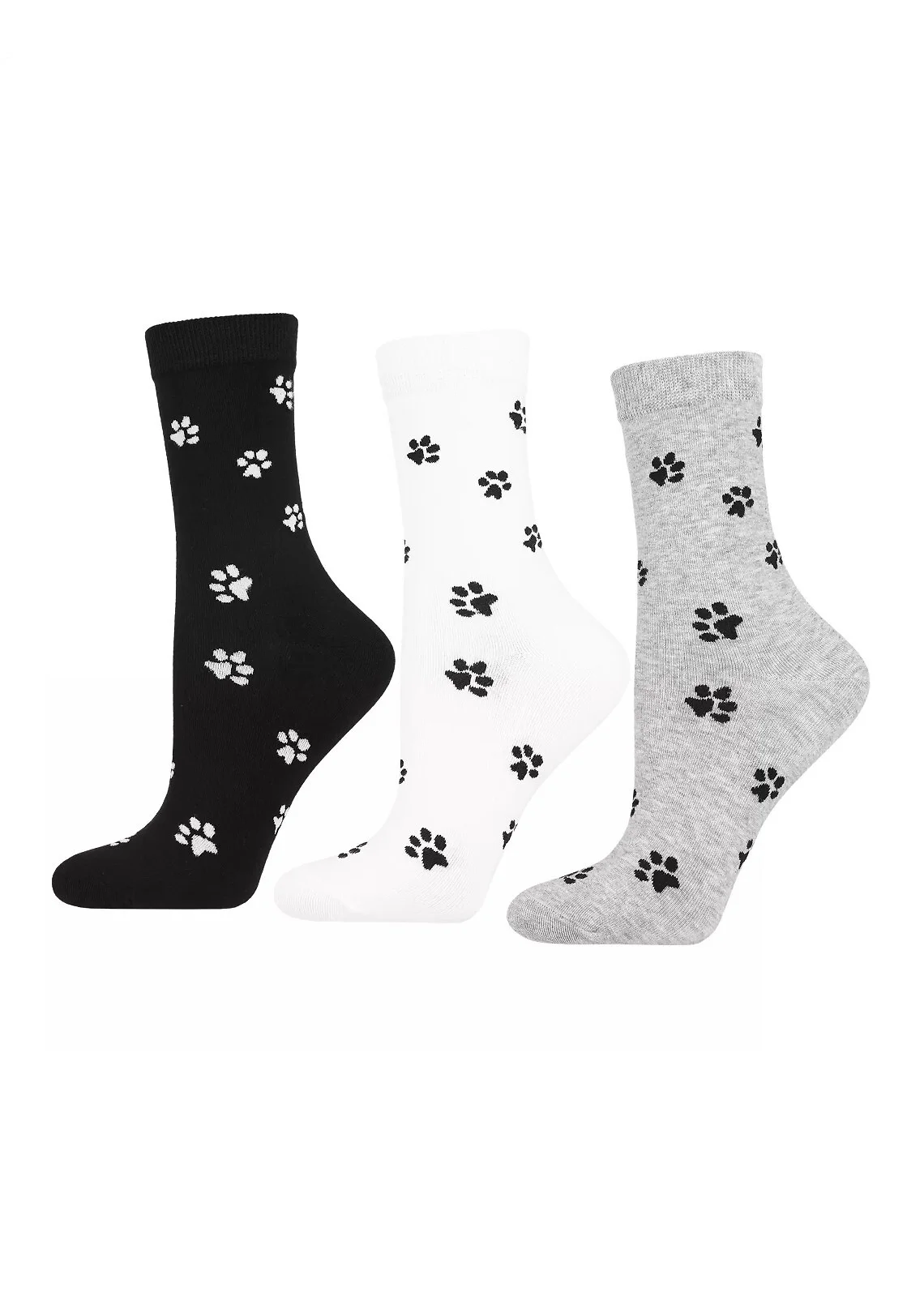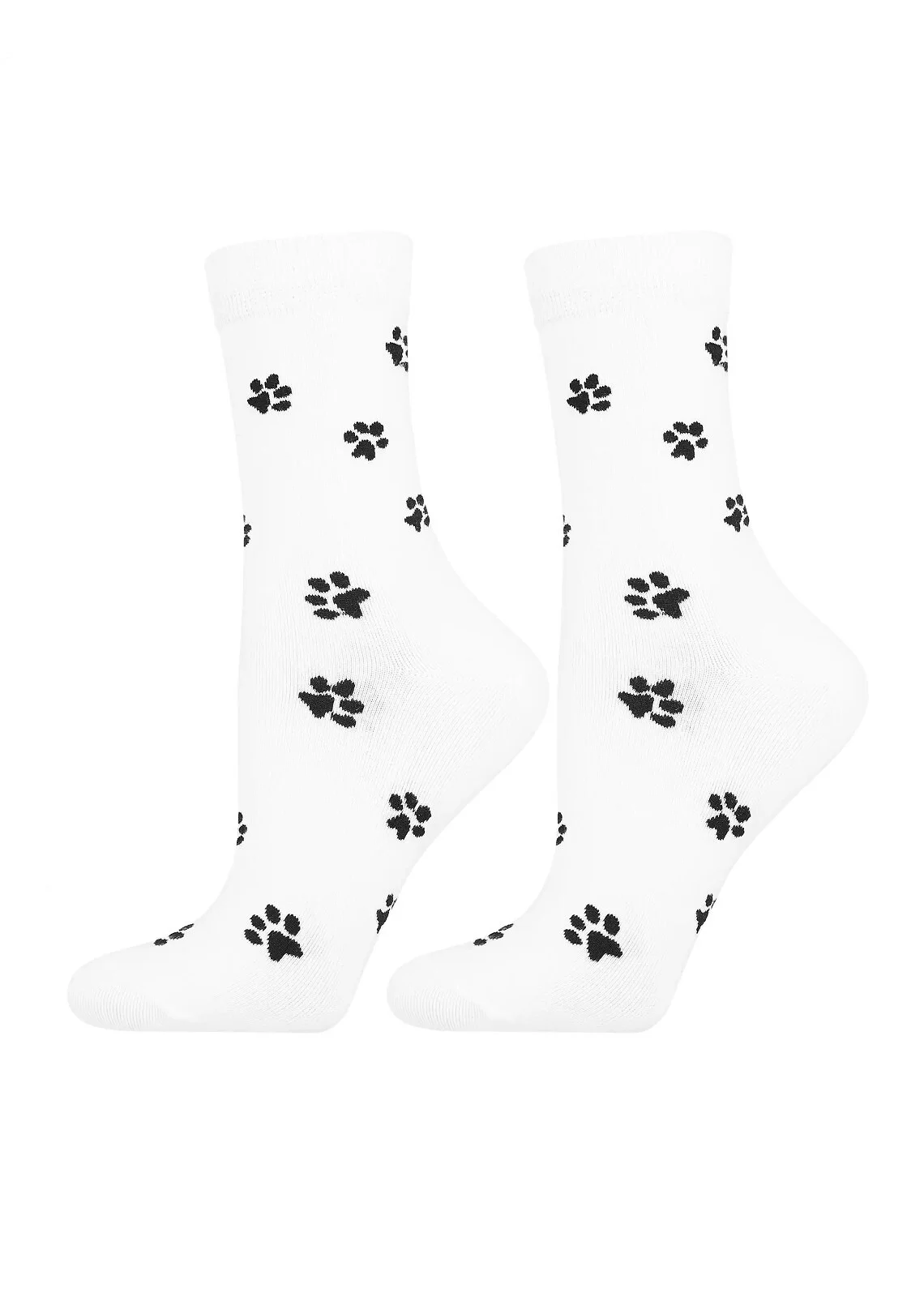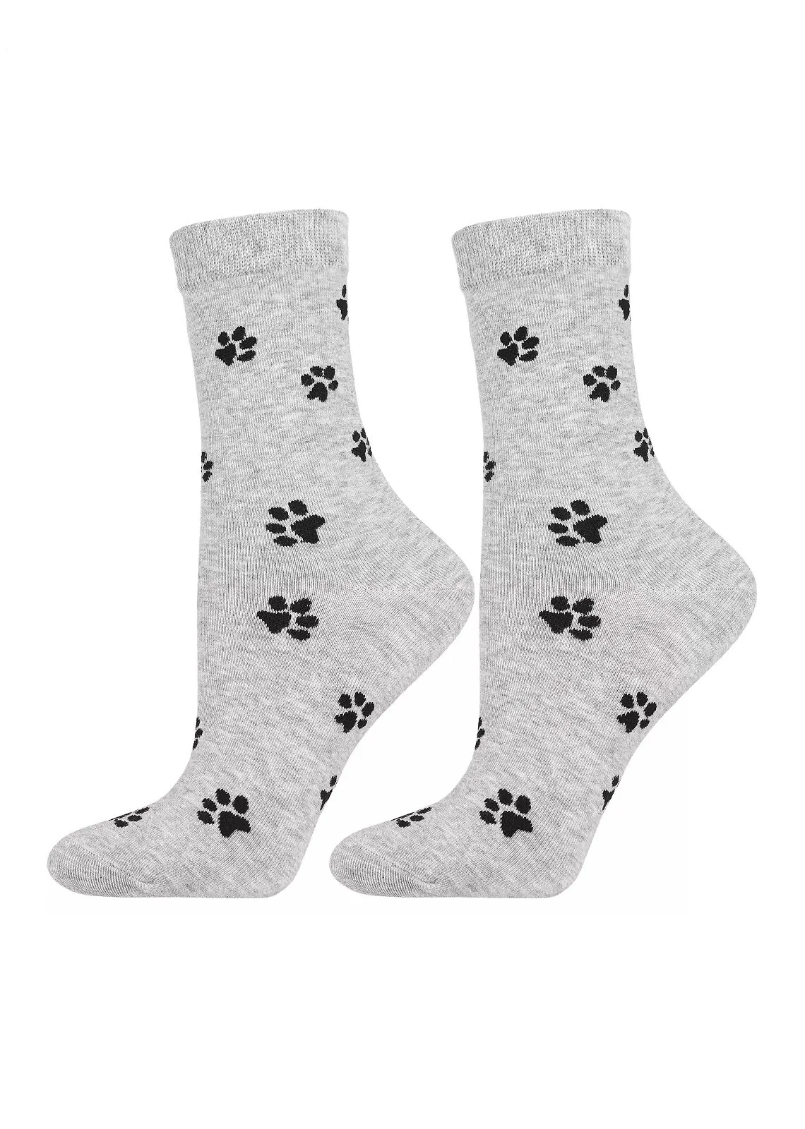 Skarpetki damskie - wykonane z wysokiej jakości bawełny - ozdobione zwierzęcymi łapkami - doskonale sprawdzą się w codziennych stylizacjach - idealnie dopasowują się do stóp - zapewniają wysoki komfort noszenia - dostępne kolory: czarny, ecru, szary wybierane losowo Skład: 65% bawełna, 30% poliamid, 5% elastan