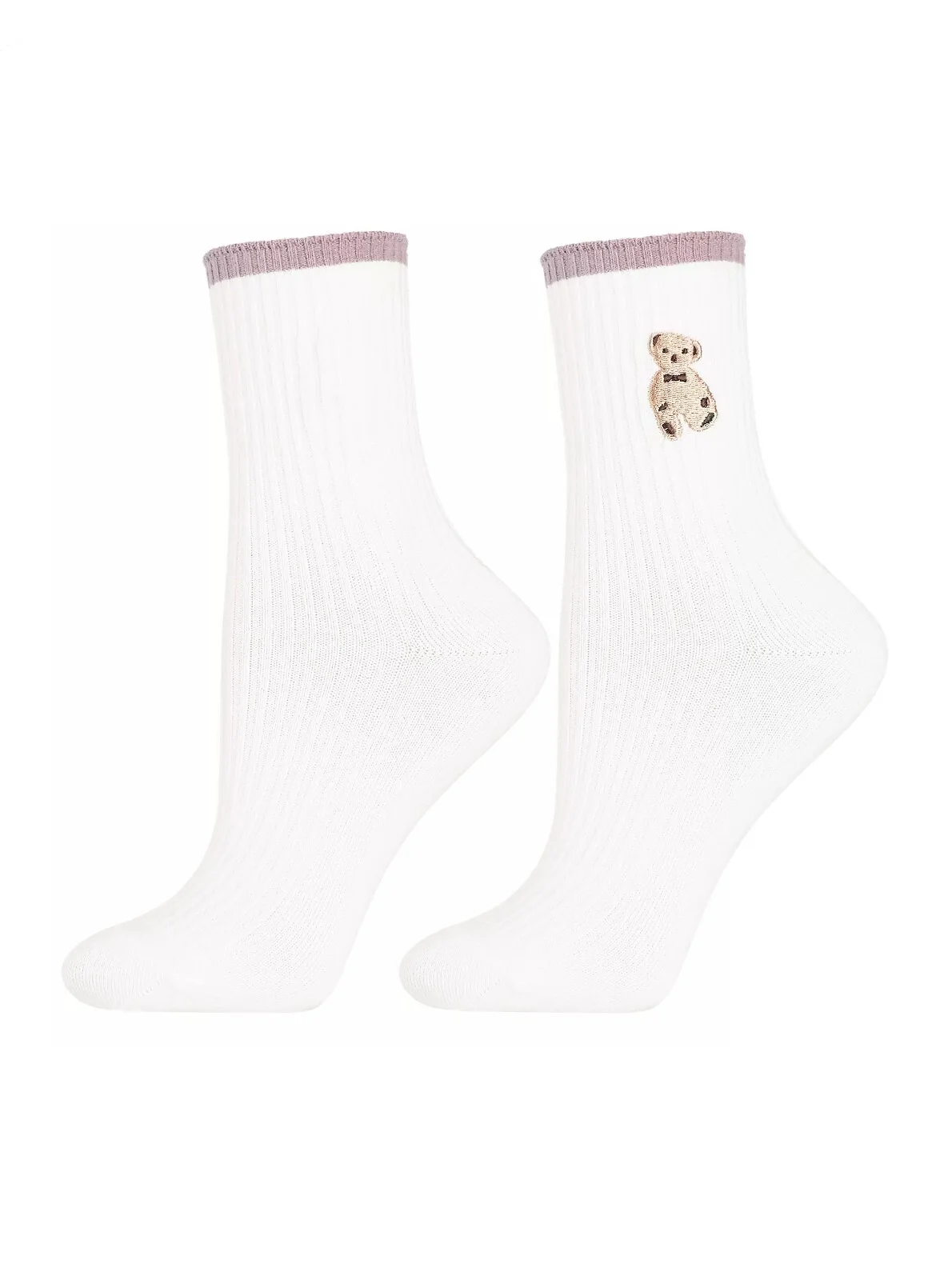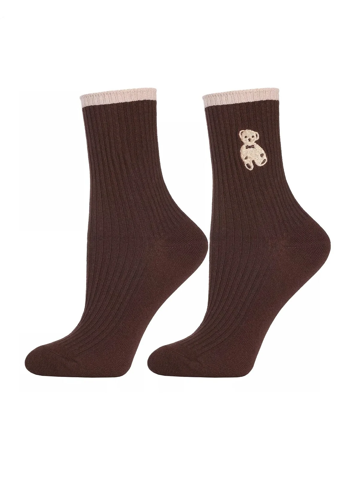 Skarpetki damskie - wykonane z wysokiej jakości bawełny - prążkowana cholewka ozdobiona misiem - doskonale sprawdzą się w codziennych stylizacjach - idealnie dopasowują się do stóp - zapewniają wysoki komfort noszenia - dostępne kolory: ecru, beżowy, brązowy wybierane losowo Skład: 80% bawełna, 17% poliester, 3% elastan