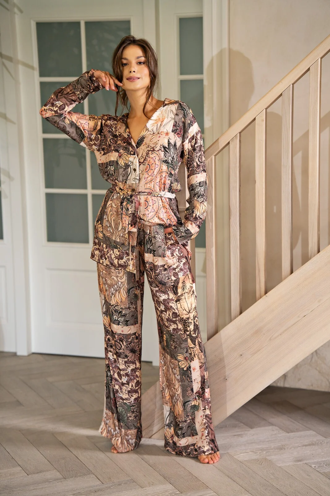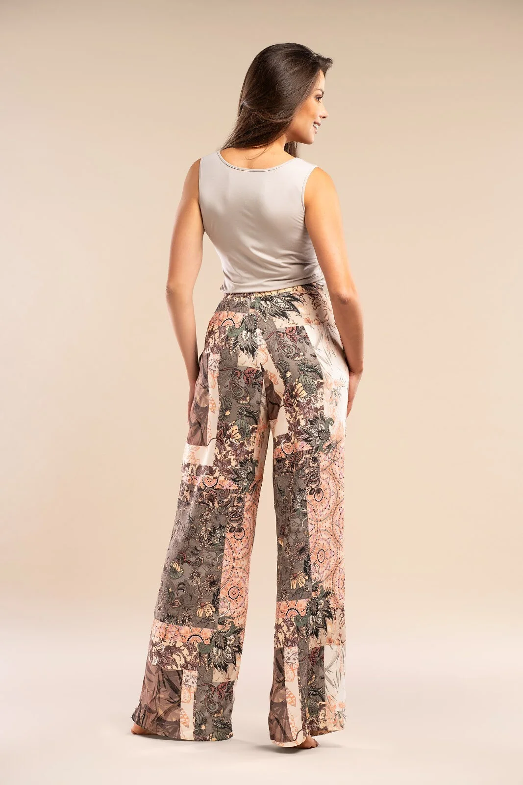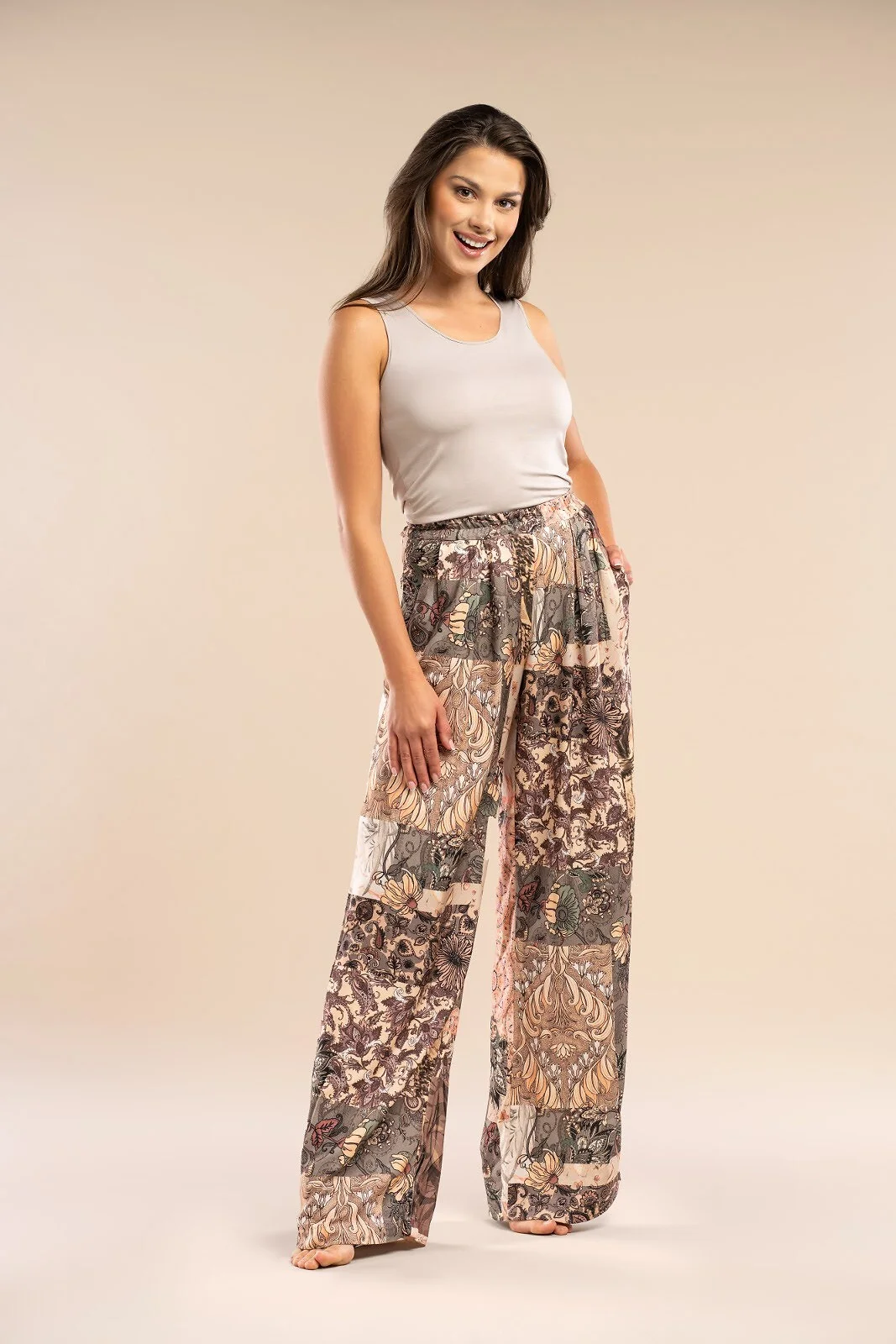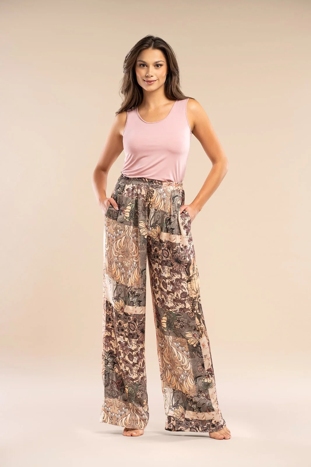 Długie spodnie damskie - wysokiej jakości wzorzysta tkanina z satynowej wiskozy - prosty, swobodny krój - w pasie guma obszyta materiałem - na biodrach wygodne kieszenie - pakowane w foliowy woreczek   Skład: 100% satynowa wiskoza