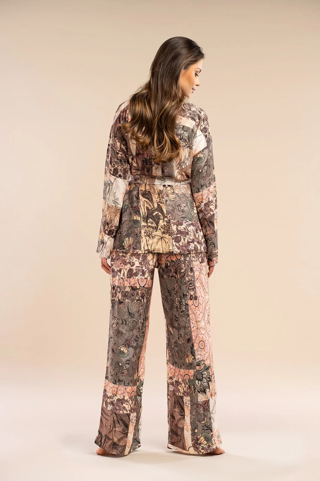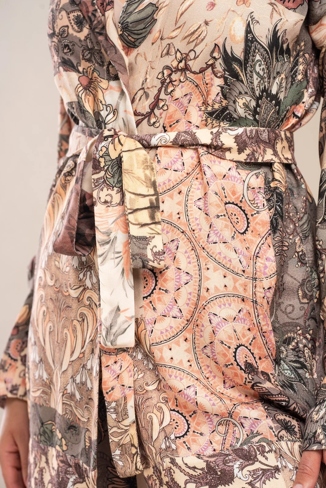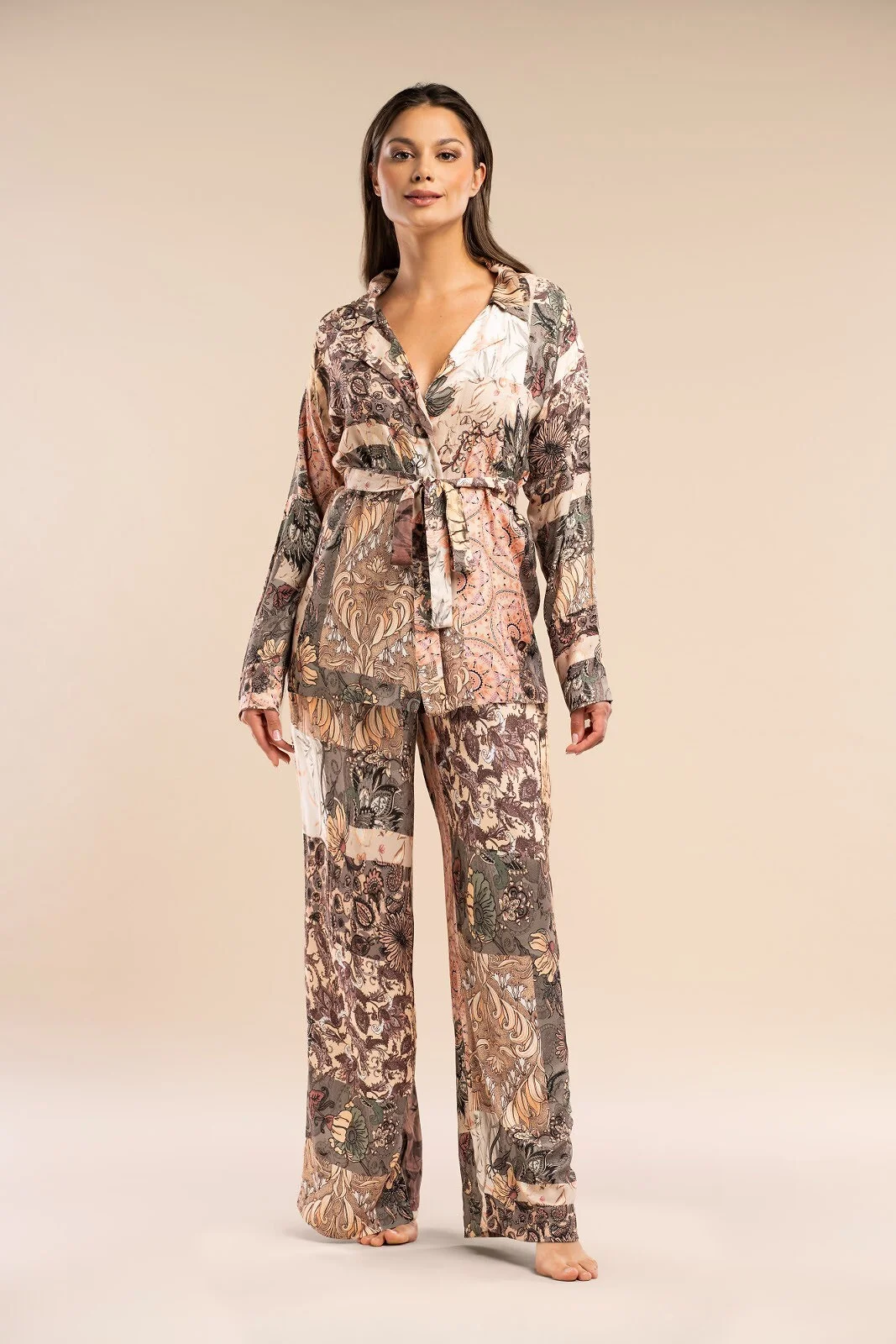 Piżamowa bluzka damska - wysokiej jakości wzorzysta tkanina z satynowej wiskozy - kołnierzyk, długi rękaw - zapinana na guziki - wiązanie w pasie - pakowane w foliowy woreczek   Skład: 100% satynowa wisko