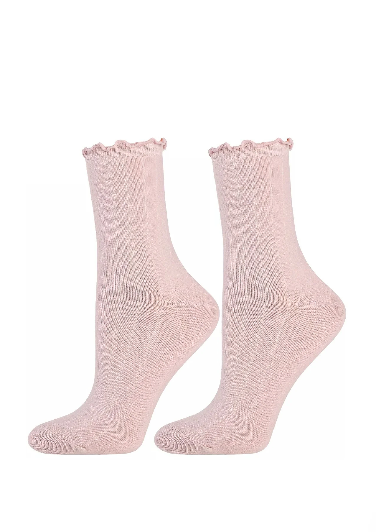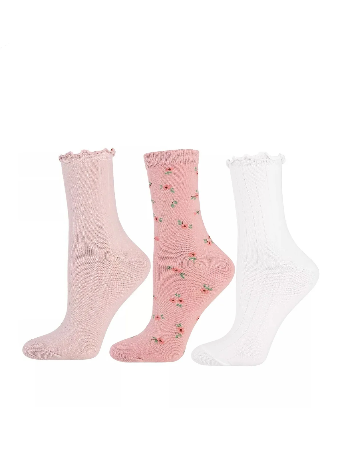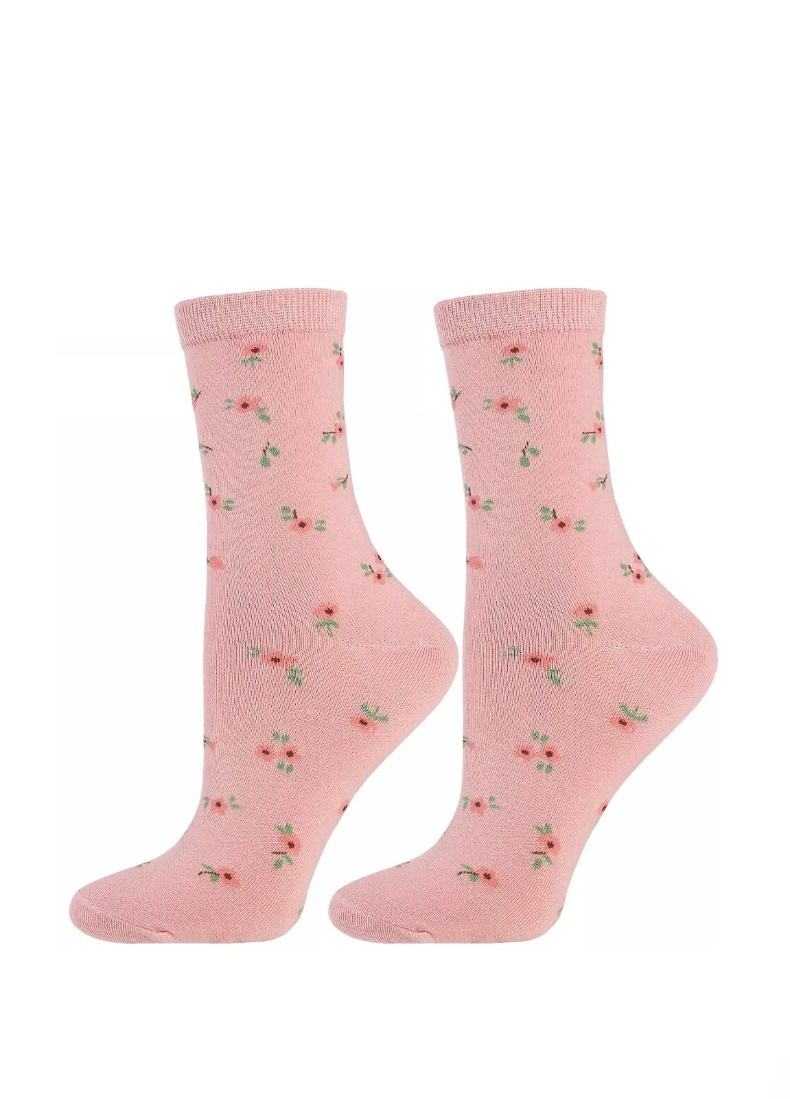 Skarpetki damskie - wykonane z wysokiej jakości bawełny - ozdobione kwiatowym printem lub szerokim prążkiem - doskonale sprawdzą się w codziennych stylizacjach - idealnie dopasowują się do stóp - zapewniają wysoki komfort noszenia - dostępne kolory: ecru i pudrowy róż są prążkowane i zakończone pofalowanym ściągaczem ; łososiowy w kwiatki-ściągacz gładki wybierane losowo   Skład: 69% bawełna, 28% poliamid, 3% elastan