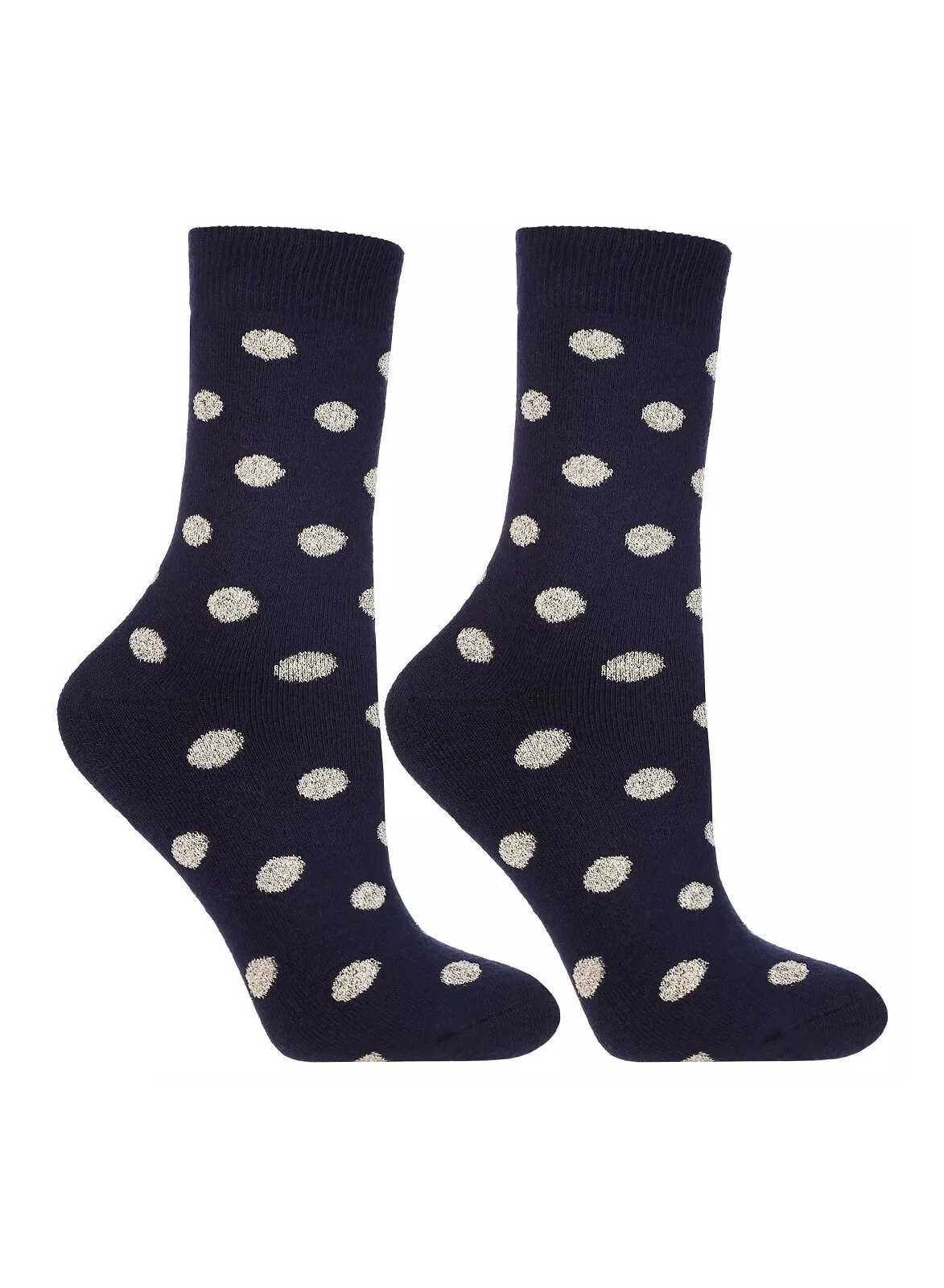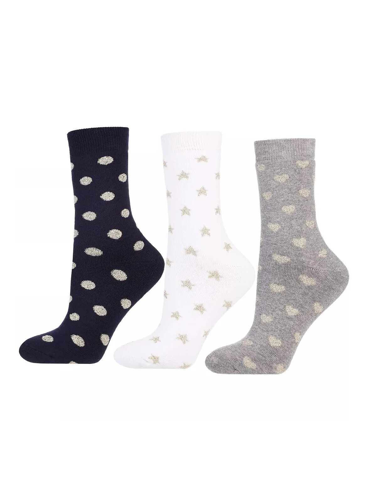 Skarpetki damskie - wysokiej jakości bawełna - ozdobione wzorem z dodatkiem połyskującej nitki - od wewnętrznej strony miękka frotta - wyprofilowana stopa - dostępne kolory wybierane losowo: szary, biały, granatowy Skład: 73% bawełna, 20% poliamid, 5% przędza metalizowana, 2% elastan