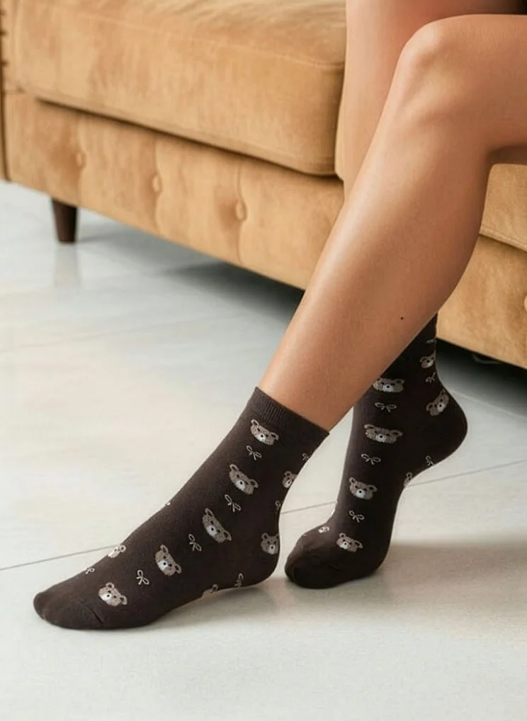 Bawełniane skarpetki damskie - z nieuciskającym ściągaczem - ozdobione delikatnym wzorem z misiami - płaski szew   Skład: 75% bawełna, 20% poliamid, 5% elastan