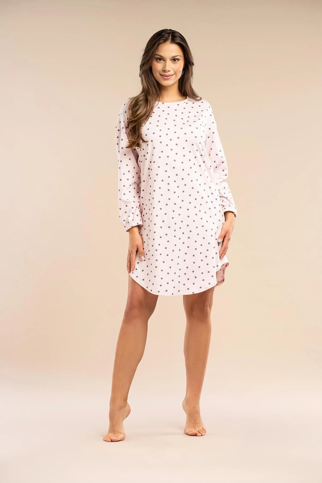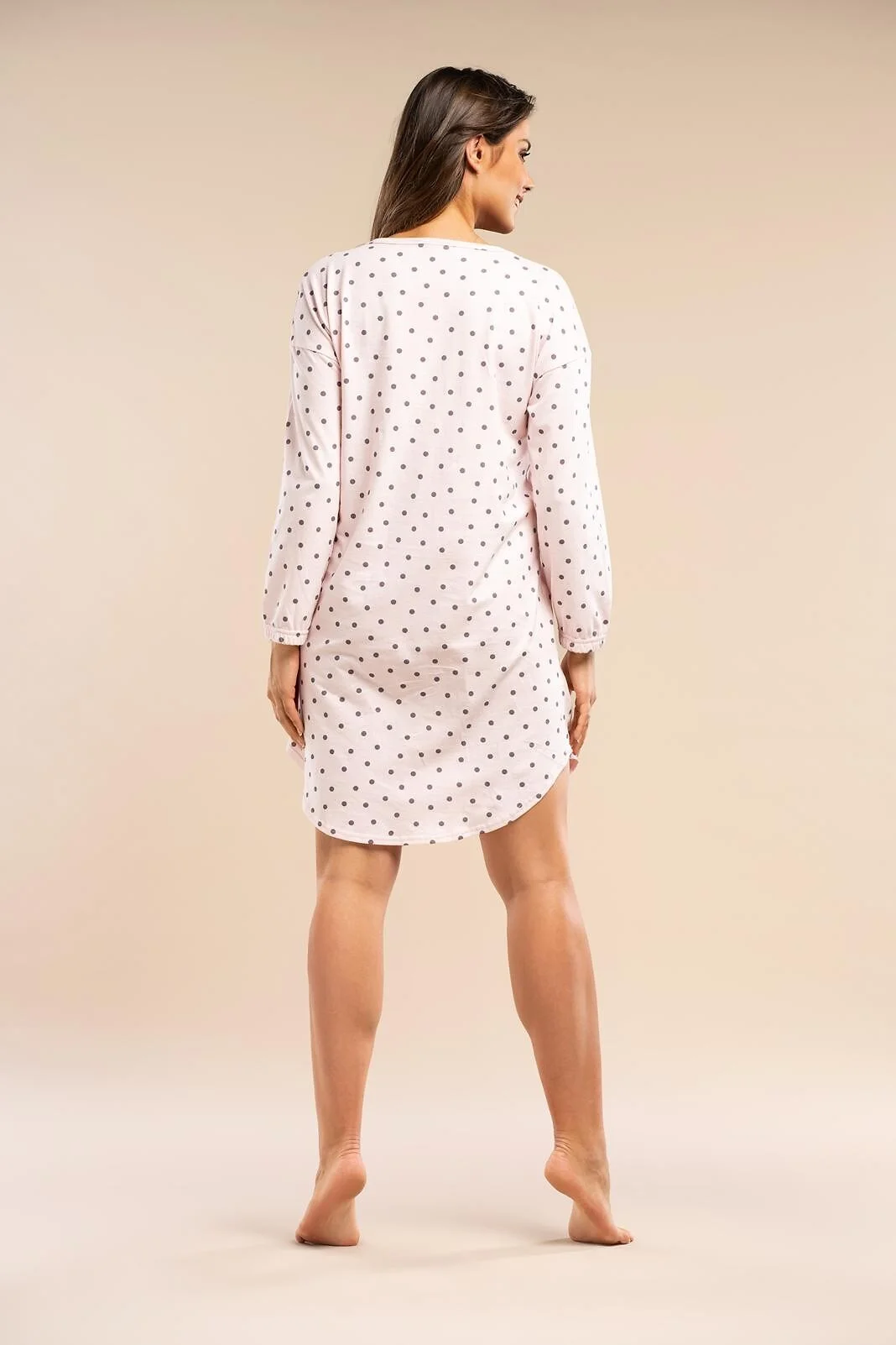 Koszula damska - wysokiej jakości bawełna - print w groszki - długi rękaw, mankiet zakończony gumką - dekolt okrągły - długość przed kolana - dół zaokrąglony - pakowana w foliowy woreczek   Skład: 100% bawełna