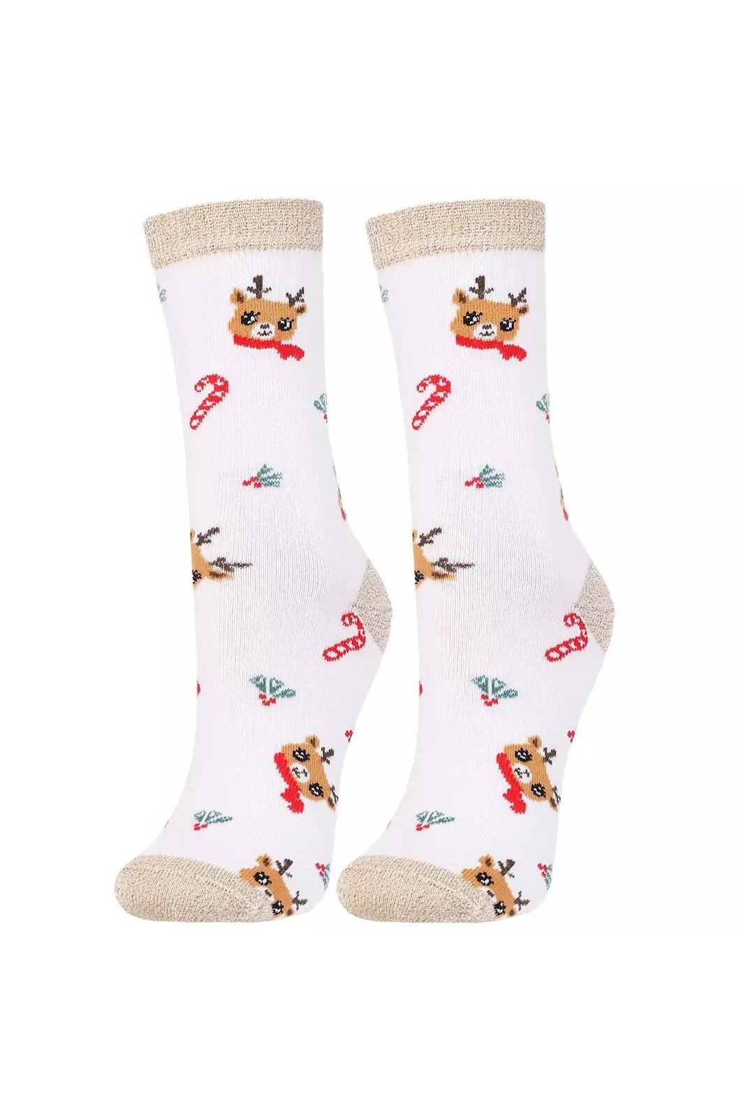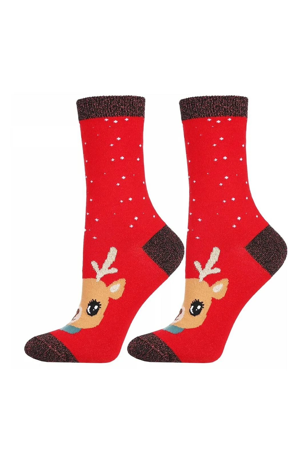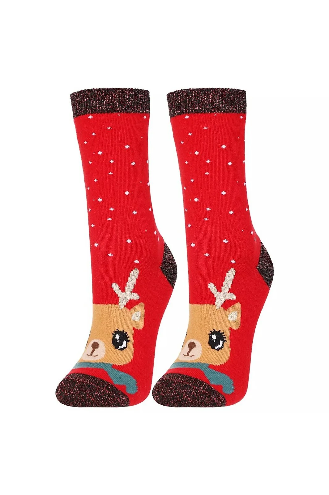 Skarpety damskie - wysokiej jakości bawełna - ozdobione kolorowymi świątecznymi wzorami - wygodny ściągacz - doskonałe na prezent - dostępne kolory wybierane losowo: czerwony, jasny beżowy, czerwony-srebrny Skład: 70% bawełna, 25% poliamid, 3% metalizowana przędza, 2% elastan