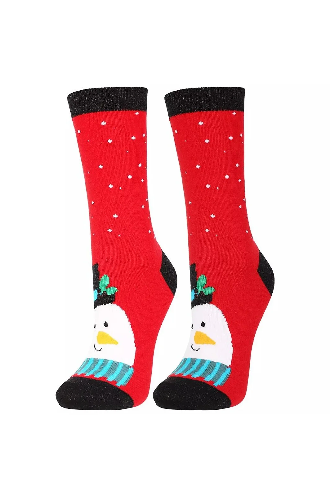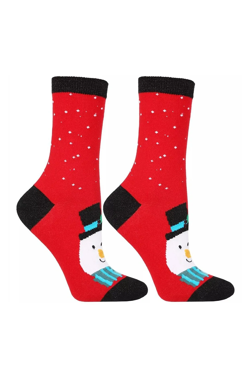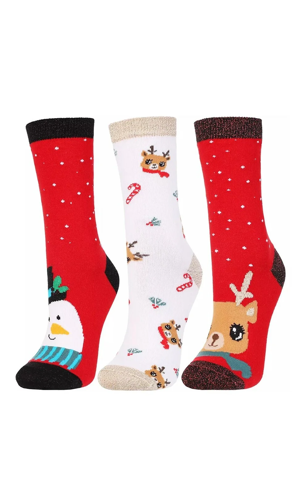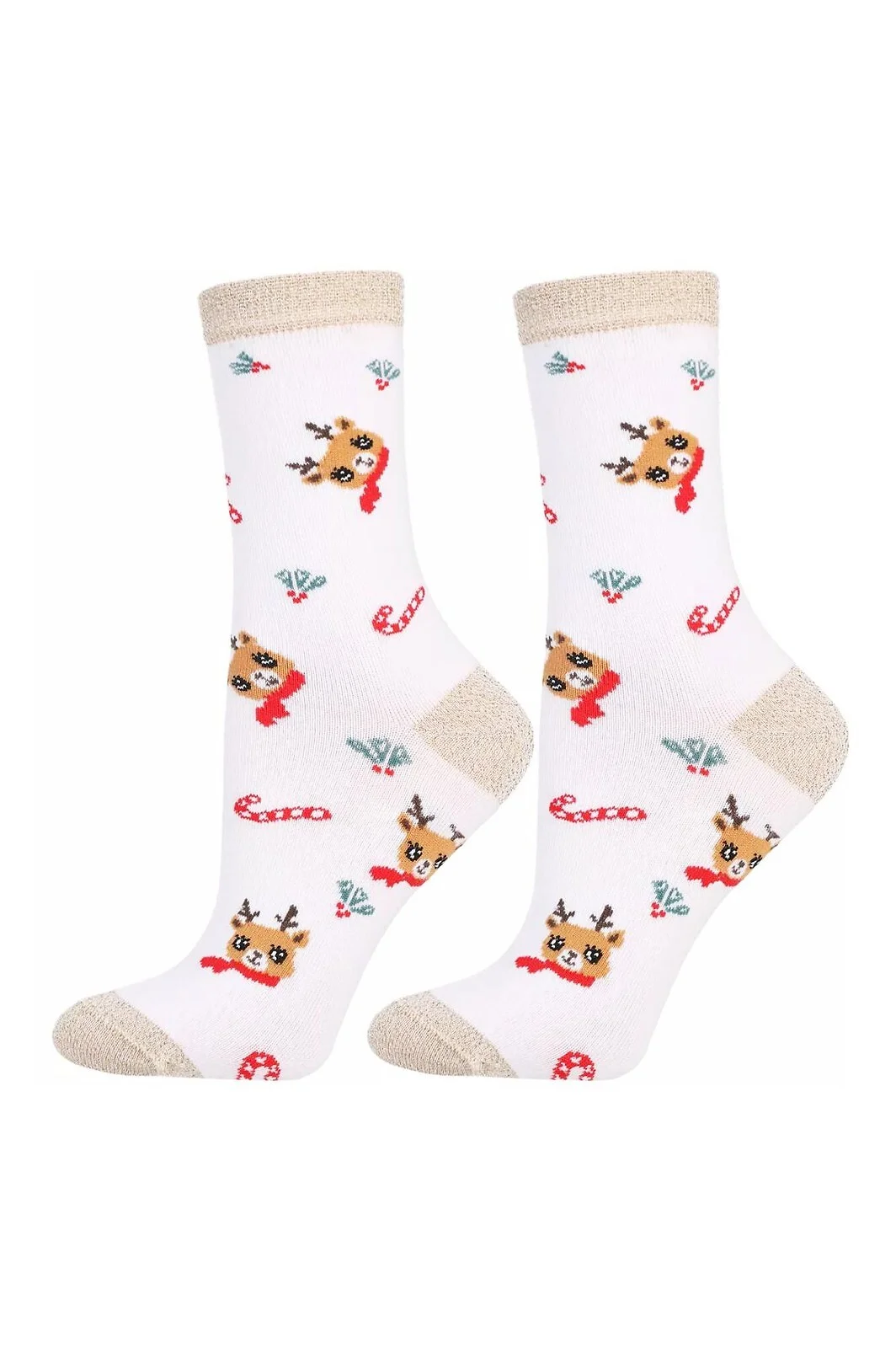 Skarpety damskie - wysokiej jakości bawełna - ozdobione kolorowymi świątecznymi wzorami - wygodny ściągacz - doskonałe na prezent - dostępne kolory wybierane losowo: czerwony, jasny beżowy, czerwony-srebrny Skład: 70% bawełna, 25% poliamid, 3% metalizowana przędza, 2% elastan